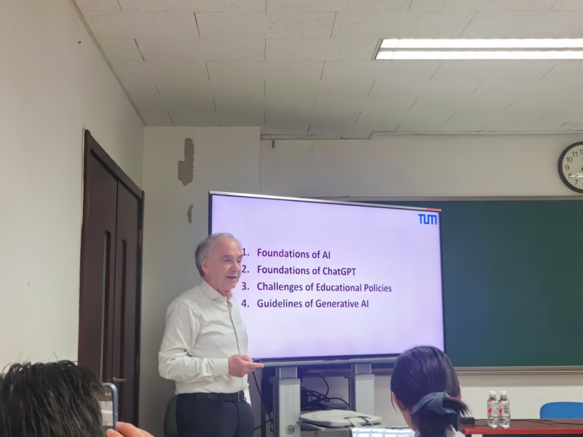 迈因策尔教授详细介绍了人工智能(AI)从数字计算到脑导向计算和量子计算的演变历程,讲座分为四个部分:AI的基础,ChatGPT的基础,ChatGPT对于教育政策的挑战,生成式人工智能的使用指南。