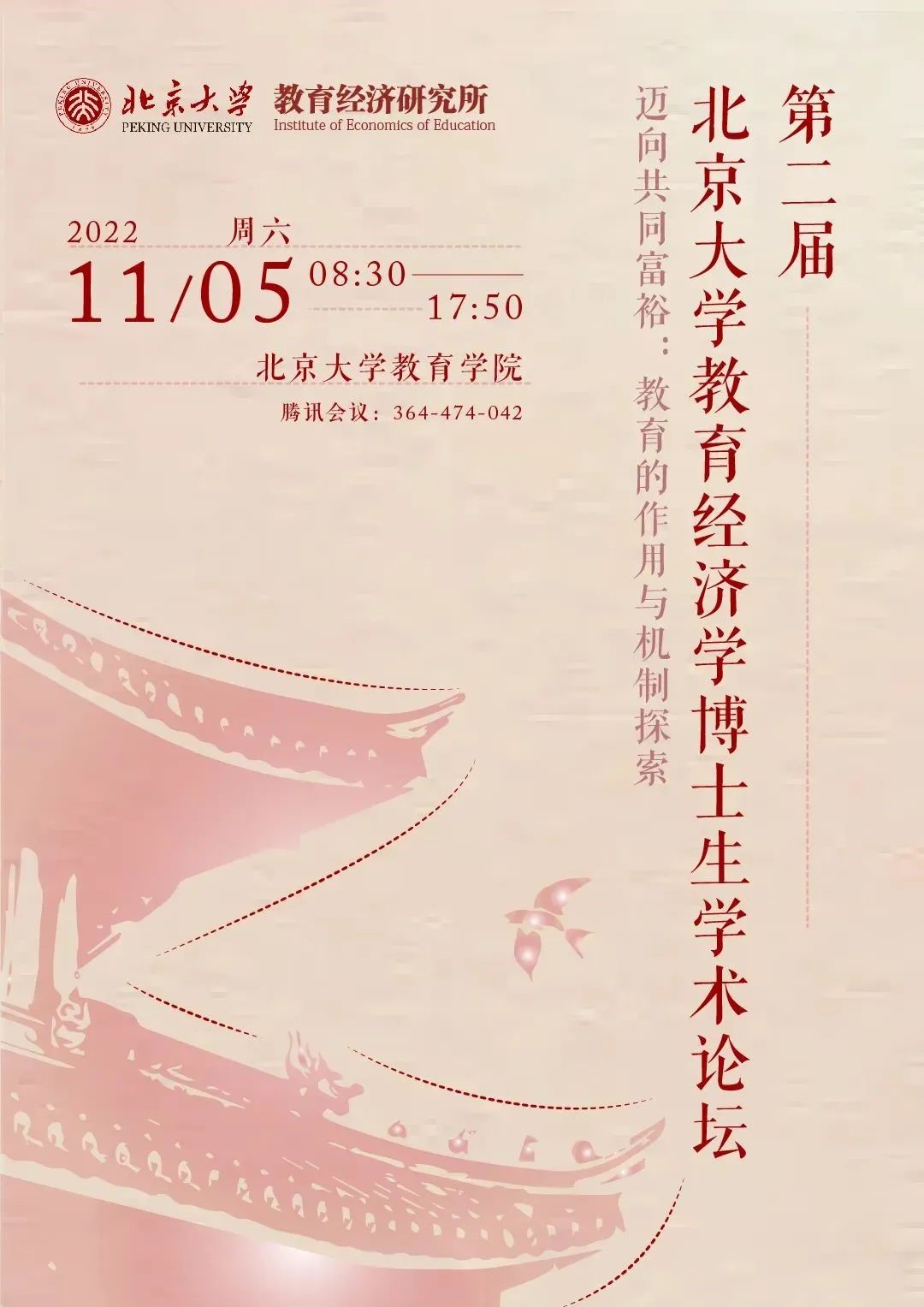 2022年11月5日(周六),北京大学教育经济研究所将举办第二届北京大学教育经济学博士生学术论坛,本次论坛主题为“迈向共同富裕:教育的作用与机制探索”,采用“线下与线上”相结合的方式。下面一起来详细了解论坛议程吧!