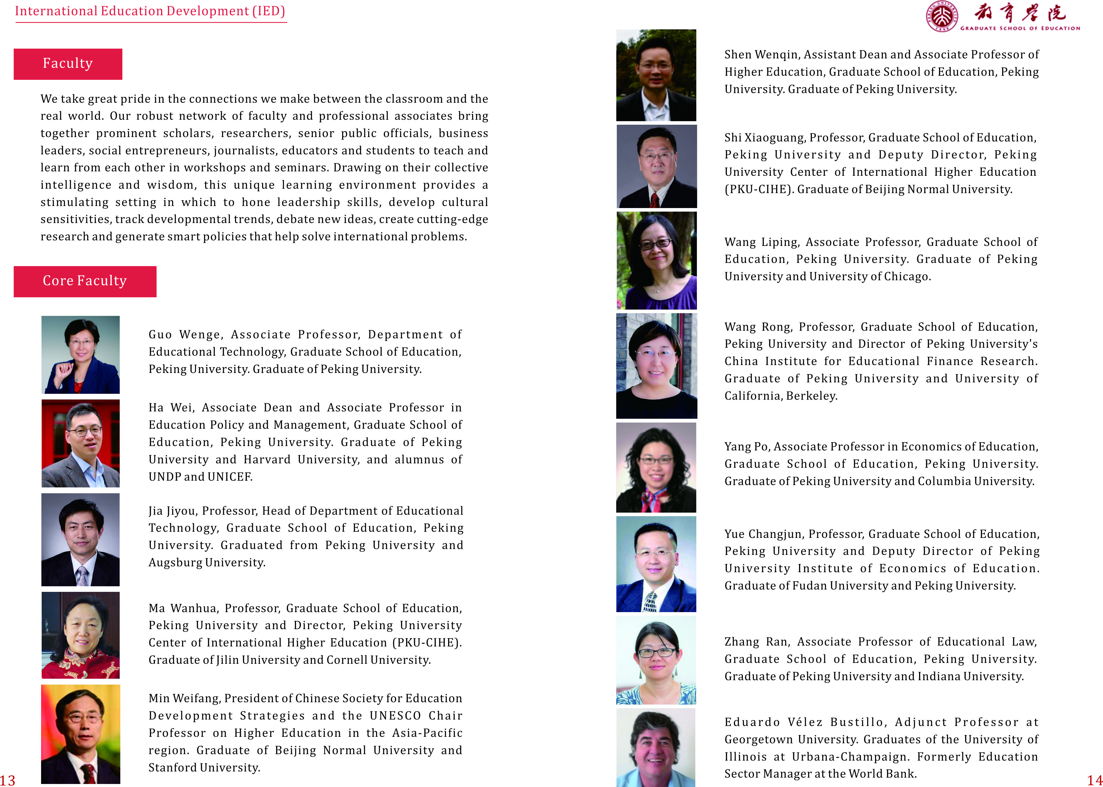 This program leverages both the high-quality teaching resources and research capabilities of Peking University, the Graduate School of Education therein, and the China Institute for Educational Finance Research, as well as the practical training and expertise of the Asian Development Bank, World Bank, United Nations and other international organizations. Thus, this program focuses on expanding students' horizons internationally and allowing students to fully understand international education development, both in theory and in practice. An intimate cohort of talented international students and faculty will enable students to develop an impressive network and to really get to know their peers and their faculty. We offer our students opportunities to gain hands-on professional experience through our practicum and internship programs.