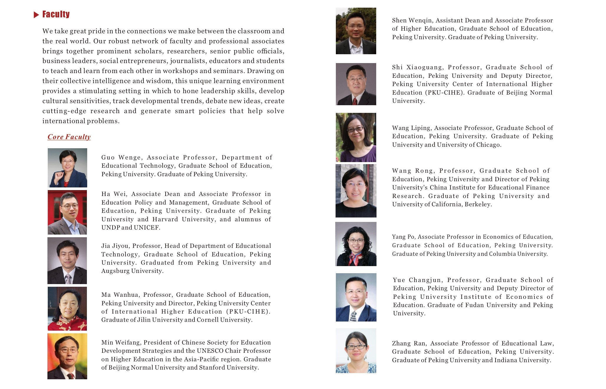This program leverages both the high-quality teaching resources and research capabilities of Peking University, the Graduate School of Education therein, and the China Institute for Educational Finance Research, as well as the practical training and expertise of the Asian Development Bank, World Bank, United Nations and other international organisations. Thus, this program focuses on expanding students' horizons internationally and allowing students to fully understand international education development, both in theory and in practice. Several of our faculty have served in international organizations and the program reflects their unique viewpoints, work experiences and international perspectives. These top scholars and practitioners will not only be your teachers, but also assume the role of mentors, advisers and experts. An intimate cohort of talented international students will enable students to develop an impressive network and to really get to know their peers and their faculty.