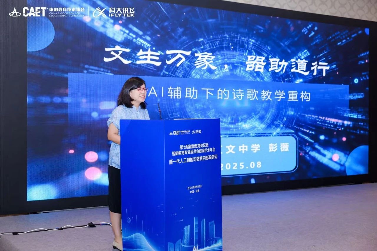 北京汇文中学彭薇分享了利用文生文、文生图及文生音频等生成式AI工具重构诗歌教学的创新案例。
