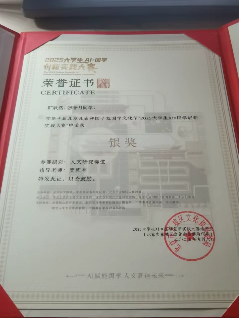 2025年8月21日,由共青团北京市委员会等多家单位支持,北京市文物局、北京市东城区区委、东城区人民政府联合主办的2025年大学生“AI×国学”创新实践大赛决赛在国子监彝伦堂落下帷幕。欧亿体育教育技术系贾积有教授指导、硕士生旷欣然和博士生张誉月提交的作品《论语启示录:AI洪流中教育的“为何”、“何为”与“何如”》从全球416支团队中脱颖而出,获得“人文研究型赛道” 银奖。