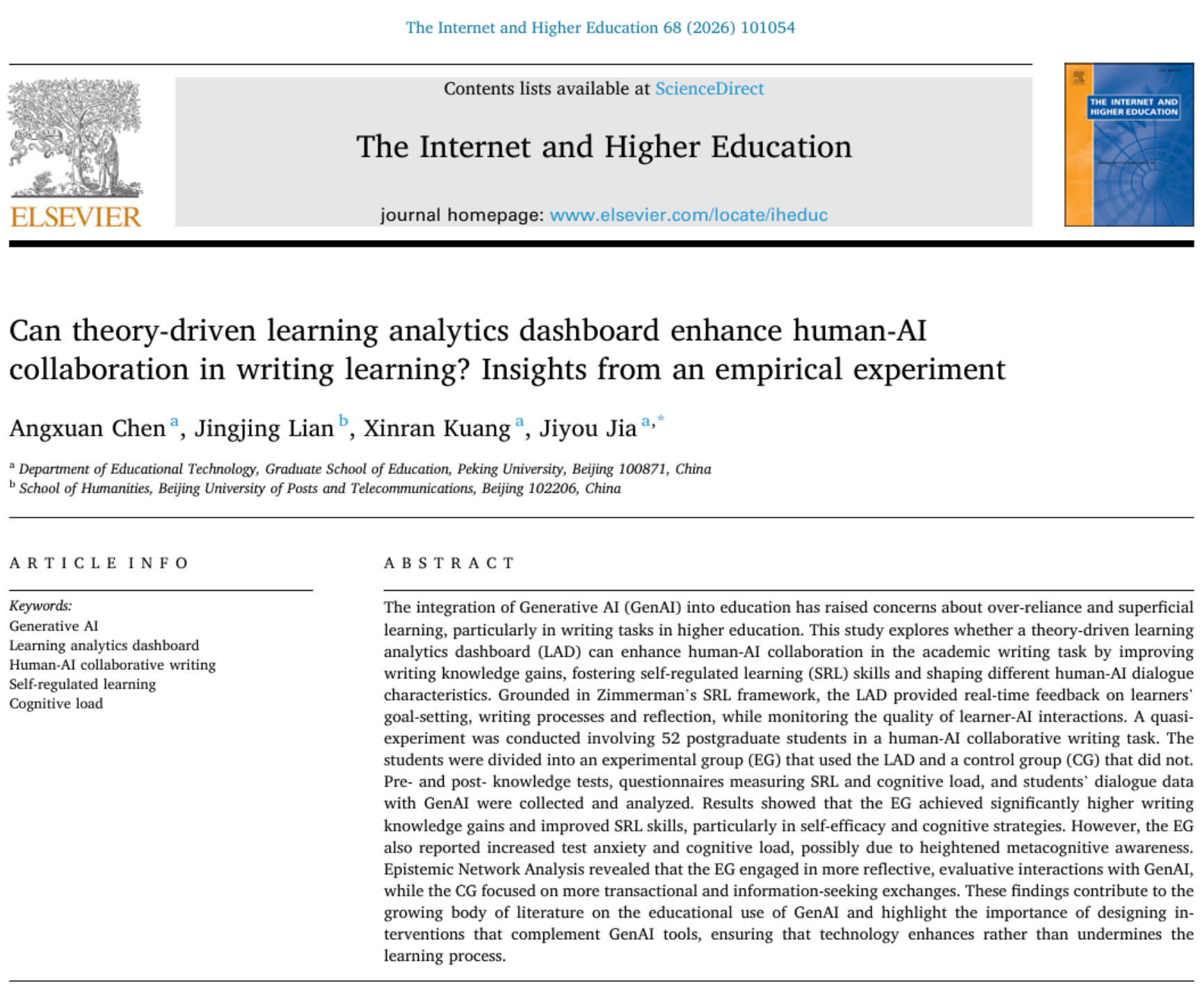 近日,教育技术系关于生成式人工智能赋能学术写作的论文《Can theory-driven learning analytics dashboard enhance human-AI collaboration in writing learning? Insights from an empirical experiment(理论驱动的学习分析仪表板能否增强写作学习中人机协作?一项来自实证实验的研究)》被国际教育技术和高等教育研究领域权威刊物《The Internet and Higher Education(互联网和高等教育)》所录用,并在线发表。该文是教育技术系贾积有教授承担的全国教育科学规划2022年国家一般课题“基于大数据挖掘的学生智能评测和辅导研究”(课题编号:BCA220208)的一项研究成果。