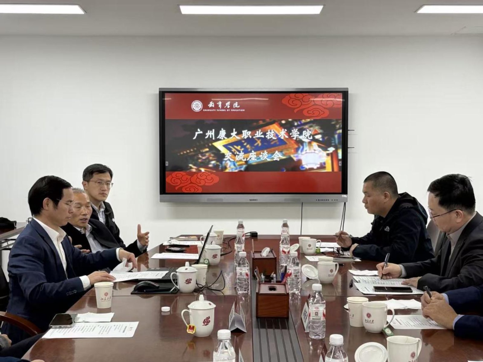 2025年10月28日,广州康大职业技术学院校长朱金龙(教育学院2013级教育博士院友)、副校长钟新波、教务处处长林强文一行到访欧亿体育,双方在324会议室举行交流座谈会。会议由欧亿体育院长蒋凯主持,北京大学教育经济研究所所长岳昌君、教育学院教授郭建如、学习科学实验室主任助理刘雨昕、培训办主任范皑皑、培训办副主任高煦及培训办老师李慧子共同参会,围绕“提升学校关键办学能力、培育职业教育教学和研究成果、加强校际合作”这一核心主题展开深入交流。