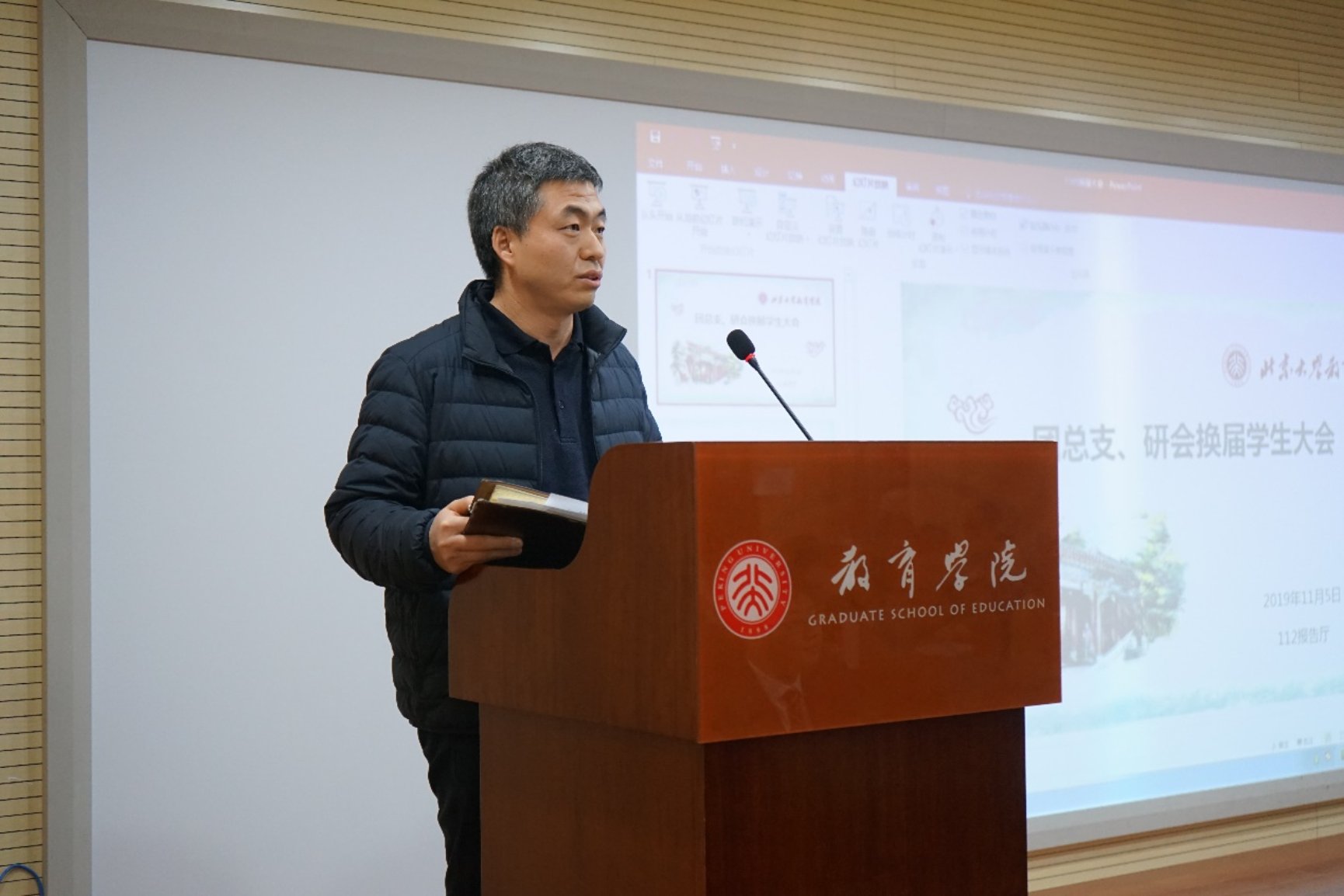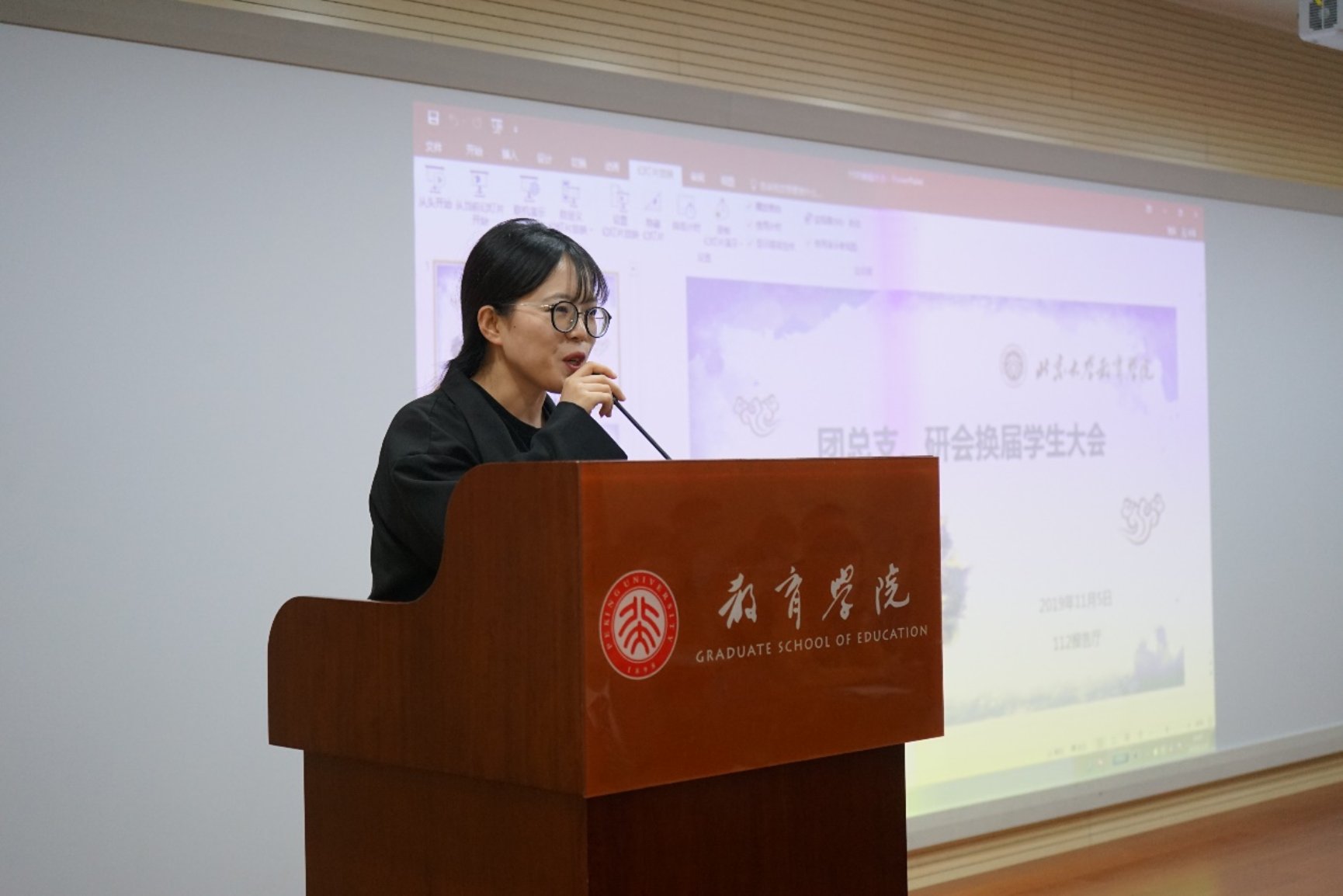 随后,大会听取和审议了团总支副书记郝晓伟和研究生会主席何家鑫2018-2019学年度工作报告。郝晓伟的述职总结了团总支一年内学术志愿服务与团务组织工作特别回顾了在建国70周年、五四运动100周年之际,本届团总支鼓励号召全院同学积极参与相关重大活动,为祖国的辉煌历史和伟大复兴献礼。何家鑫梳理了一年内研究生会的各项重大活动介绍了上一届研究生会在文艺、体育、学术、生活、权益各方面创新尝试以及同学们在教育学院的学习生活增添亮色所作的努力