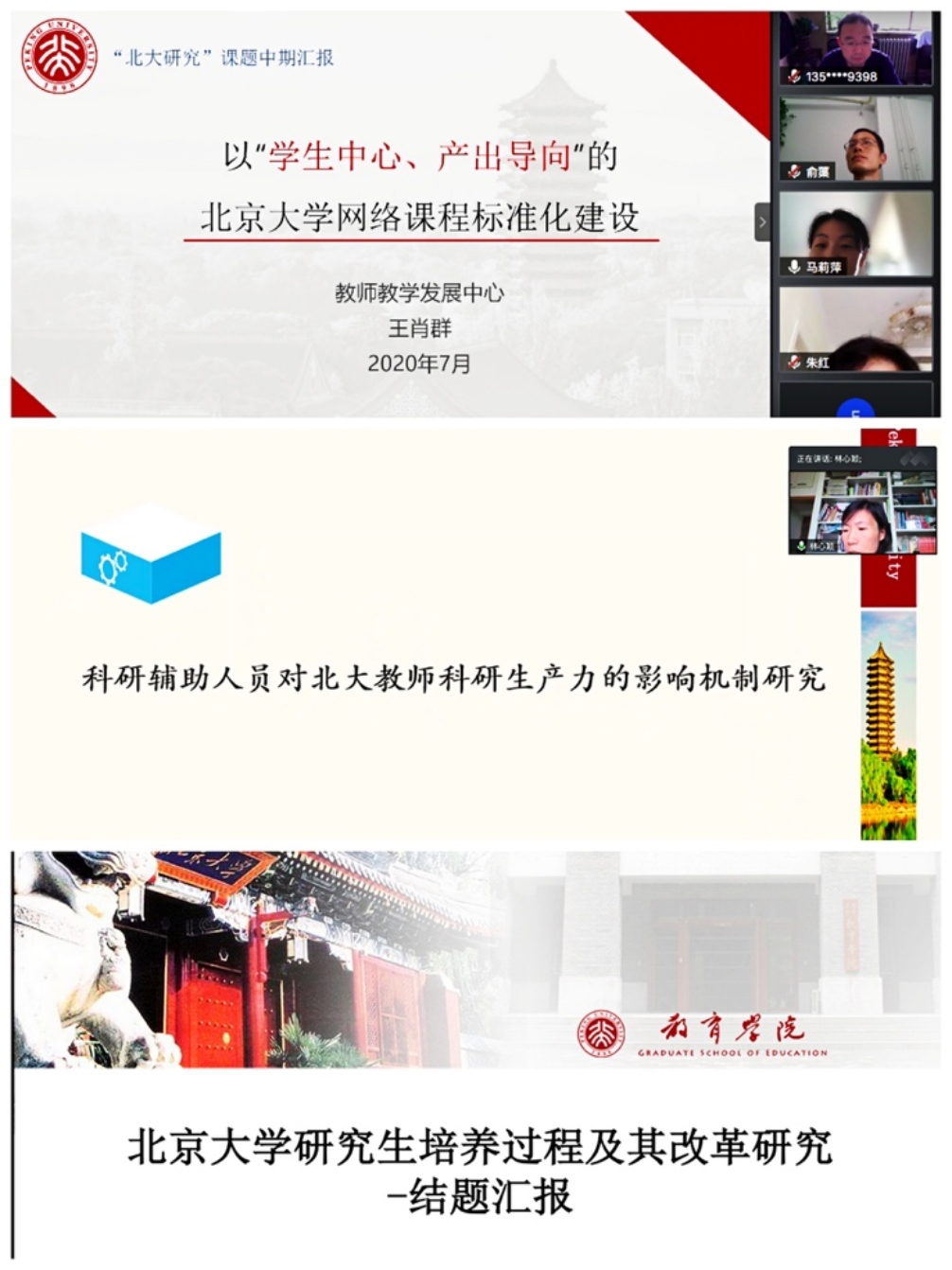 评审专家认真听取了课题负责人的汇报,就课题研究中存在的问题以及未来可进一步研究的方向提出了意见,尤其强调课题研究过程中要注重与学校管理工作相结合,形成校内跨部门合作,突出研究特点,加强与北大发展改革中的重大问题的结合度等。最后,专家们对课题进行了线上匿名投票。经表决,“北大研究”重点课题—— 《“以学为中心、产出导向”的北京大学网络课程标准化建设》《科研辅助人员对北大教师科研生产力的影响机制研究》通过了中期答辩,按期进行下一步的研究;《北京大学研究生培养过程及其改革研究》顺利结题。