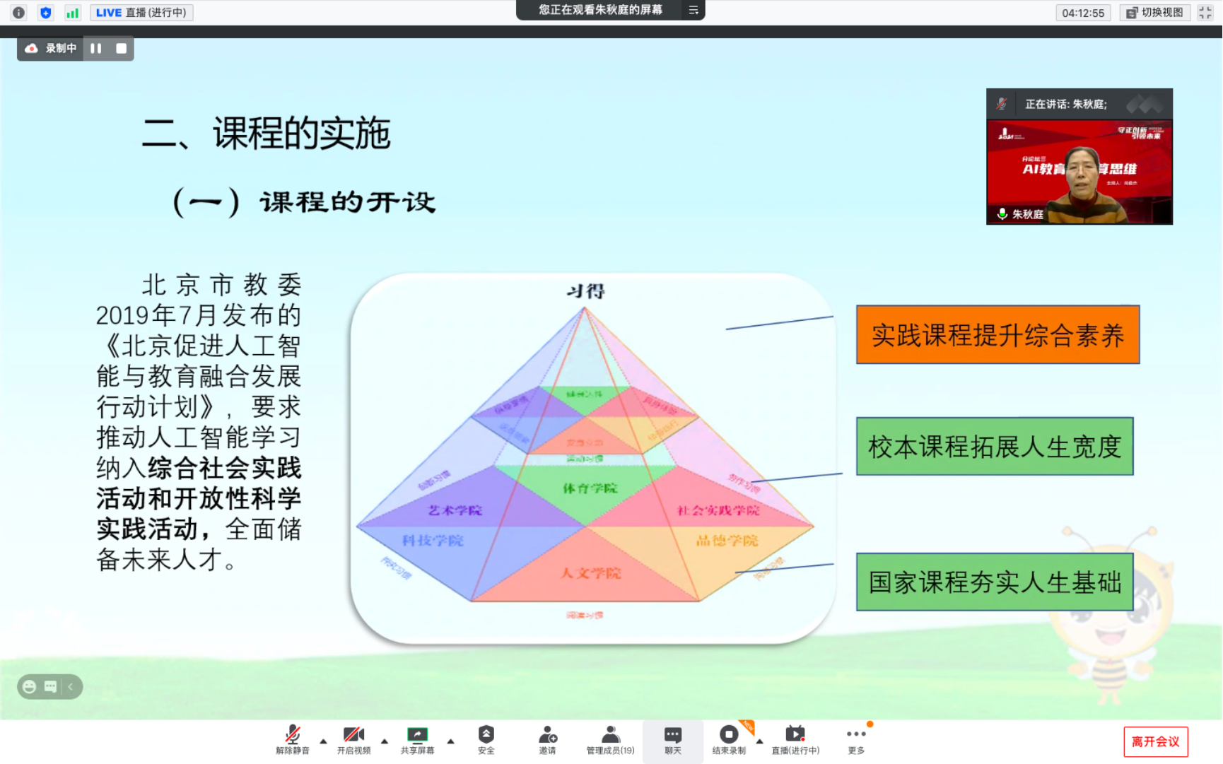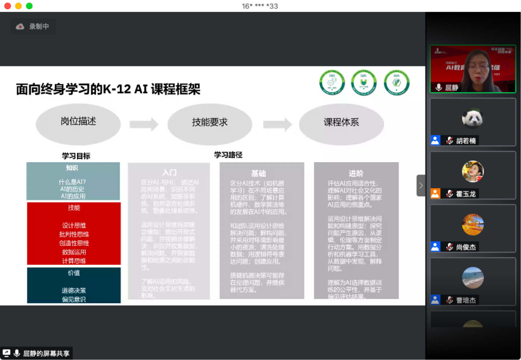 北京教育学院朝阳分院胡秋萍主任认为计算素养和人文素养、科学素养并列成为影响人终身发展的素养通过自身的项目学习研究经验指出,人工智能课程体系进入义务教育的课堂教学应该考虑青少年的认知水平和基础知识,依据现有水平来设计课程。