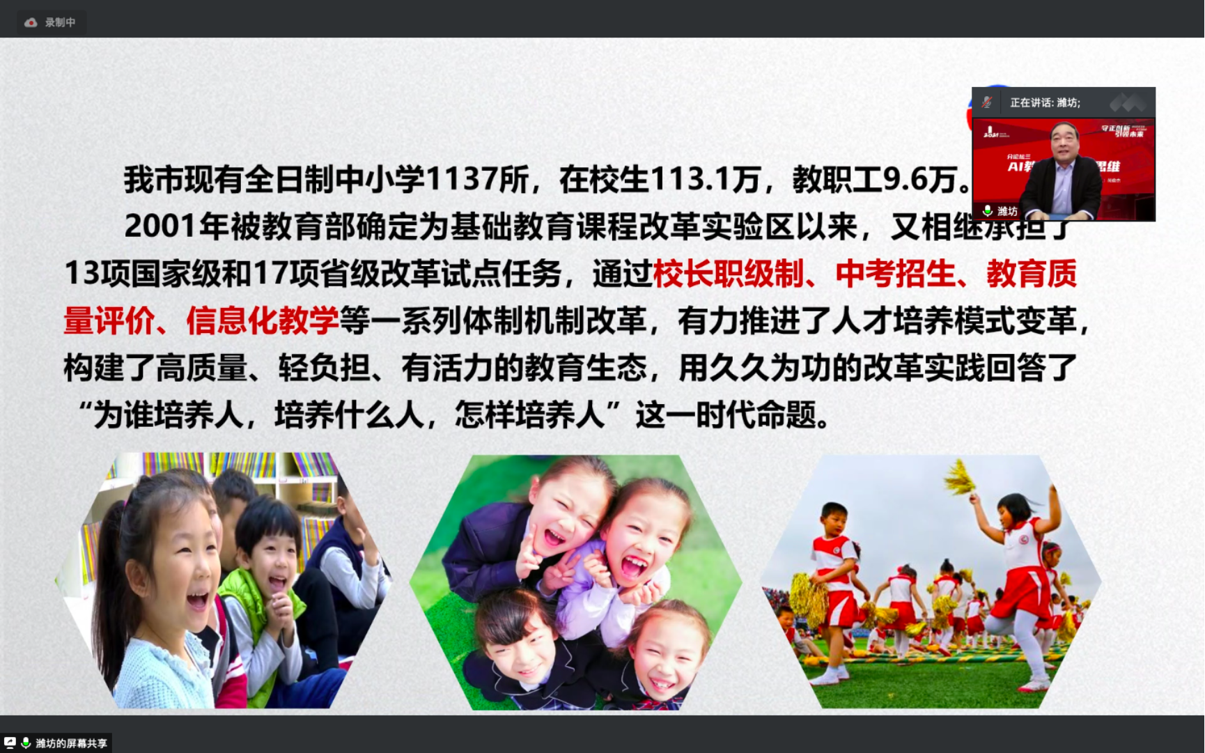 山东潍坊市教育局全平局长介绍了潍坊市推进人工智能教育的做法,潍坊市出台了《义务教育编程课程指导意见》,将编程教育、人工智能学习体验公共中心建设和“一校一创客”纳入年度教育督导。建设了潍坊市智慧教育云平台、人工智能科学院、体验中心,并通过多元路径促进人工智能培养,包括组织编写《人工智能常识教育读本》通过人工智能师资1+N模式,提升了教师信息素养,形成了丰硕的研究成果。