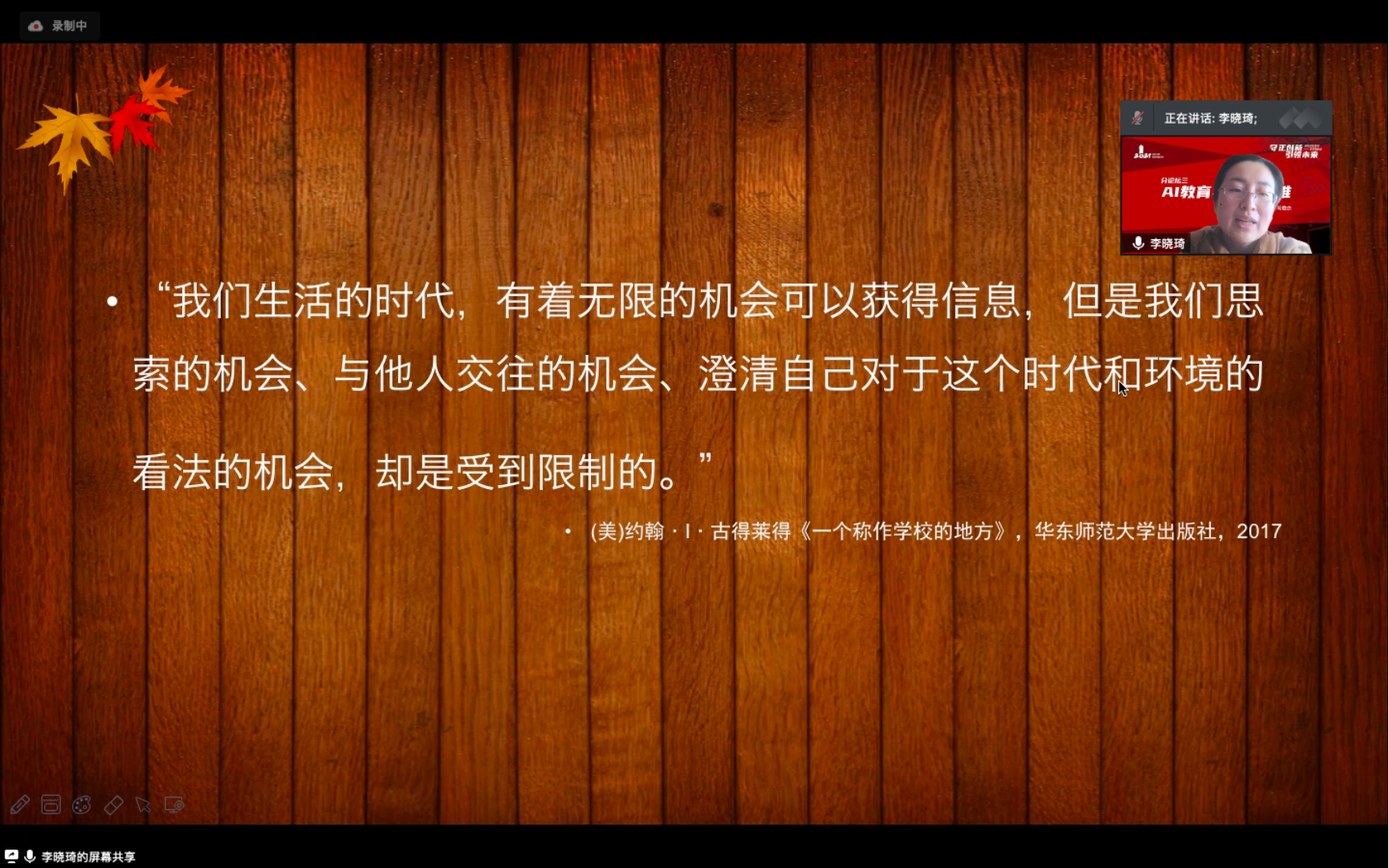 北京市怀柔区教委徐志芳主任从人工智能与教育人工智能教育实践反思等三个方面谈人工智能教育。结合区域教育实践,徐主任认为人工智能大致集中在底层技术平台共建,平台应用的共建,智能化的教育装备。人工智能教育实践方面怀柔区自引入人工智能与教育融合的行动计划,积极推动基础教育阶段的人工智能普及。徐主任认为人工智能对学生的逻辑和计算思维的提升很有帮助,是怀柔区科技建设模块的重点实践中需要教研人员、信息技术专家等多方协同合作开发课程,构建人工智能学习平台和学习资源。