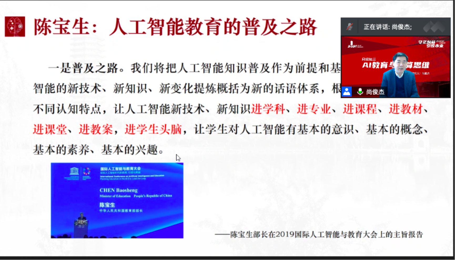 第三位主讲的嘉宾是北京大学基础教育研究中心尚俊杰副主任,报告主题是人工智能与计算思维培养尚俊杰从人工智能教育的发展背景、我的理解和实践经验三大方面做了介绍通过对以下几大问题的解答(人工智能教育的人才培养目标是什么,是提升全民素质还是培养创新人才呢?人工智能课程的目标是什么?人工智能教育课程内容体系怎么安排?人工智能教育课程应该采用什么教学方法?人工智能教育课程的支持服务模式?,指出,人才培养目标是在提升全民素质基础上重视创新人才的培养课程教学目标是重在培养计算思维,编程教育也很重要,创造性思维、设计思维也需要多关注。在课程内容体系上,需要尽快研究完整的课程内容体系,要和编程课程、STEM、创客、信息技术课程有机协调。在教学方法上,要重视项目学习,同时重视知识系统讲授,尤其对小学生来说重视玩中学。支持服务模式上,以云教学作为支持,软硬件结合。
