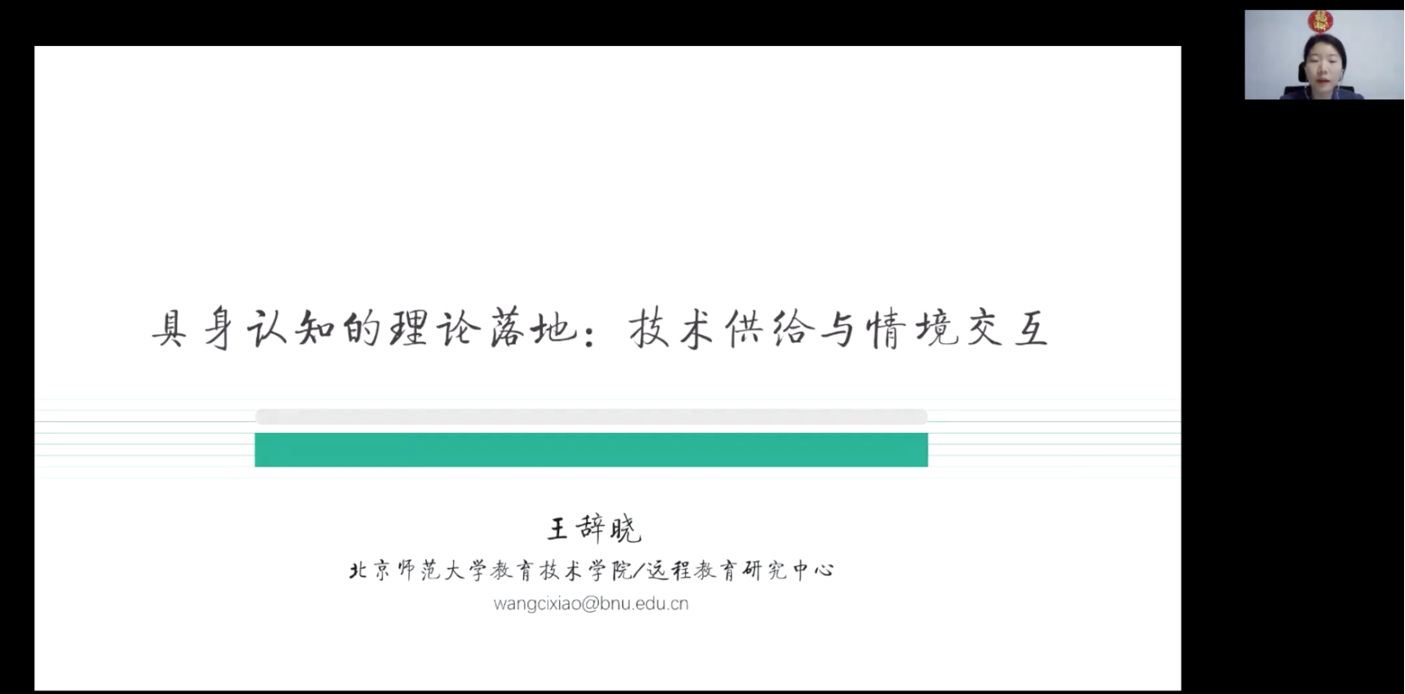 北京师范大学教育学部青年教师王辞晓博士的报告题目是《具身认知的理论落地:技术供给与情境交互》。她介绍了在具身认知领域的研究成果,详细阐述从具身认知的概念、人与技术的关系、具身认知与虚拟和真实教具的关系等。