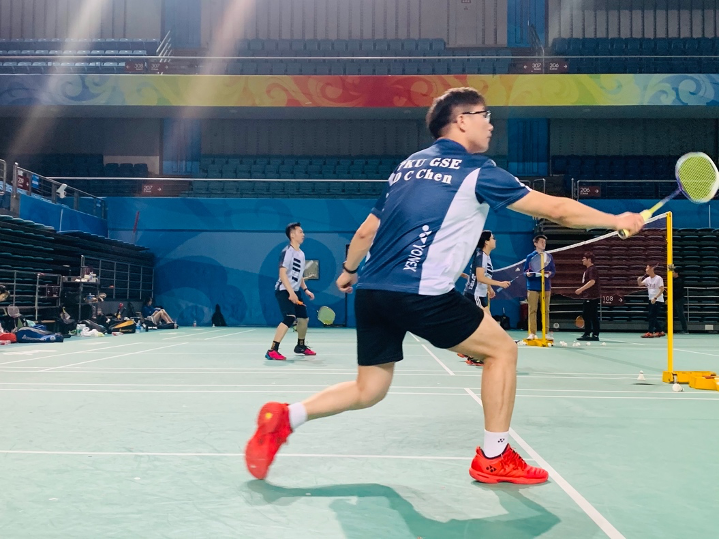 第二天比赛为淘汰赛赛制,每一项采用三局两胜制,这对队员的体力和意志都是一种考验。八进四比赛首战C组第一的地空学院,队员们都知道这将会是一场艰难的比赛,因此大家七点多就早早赶到球场,在球馆还未开灯的情况下,借着微弱的室外光开始热身和练球。混双依然由陈得春和代颖首先出战,第一局两人似乎还未从睡梦中醒来,首战失利;但是两人迅速调整状态、总结教训,易边再战,两人发挥稳定,第二局比赛扳回一城,第三局比赛两人继续保持状态,不急不躁,最终以21:19拿下决胜局,2:1为联队首先拿下一分。随后郭丛斌老师和乐惠骁的男双组合以2:0为联队再拿一分,随后陈得春兼项男单以21:4和21:9的大比分再下一城,教育社会联队以3:1提前结束比赛,冲进四强!