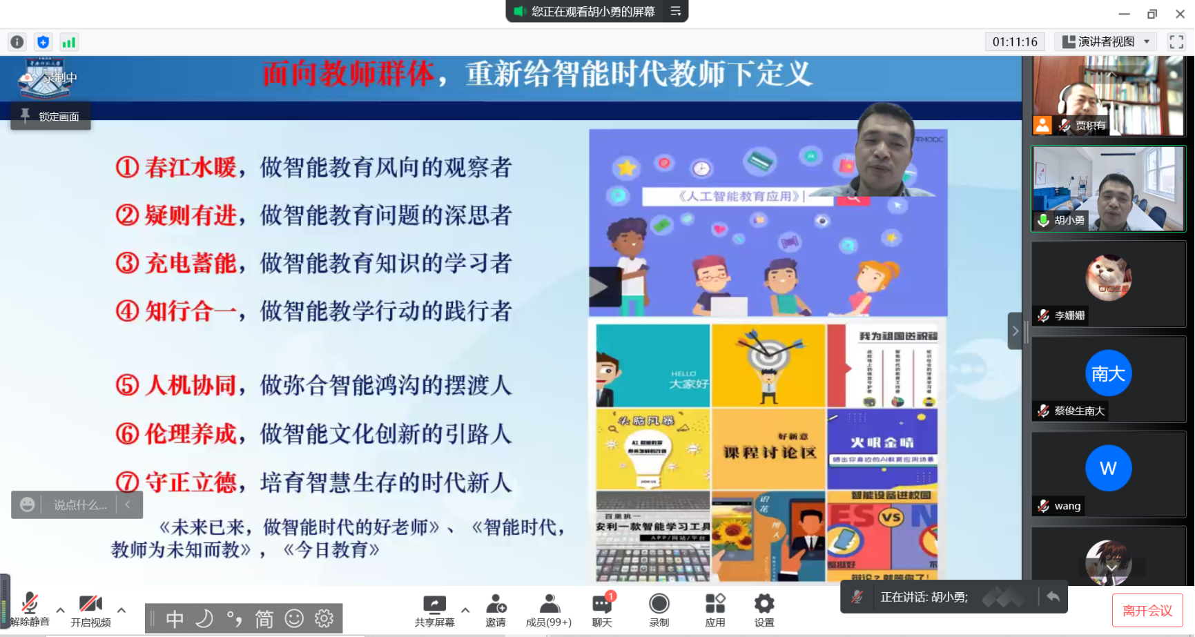 在第四部分,胡教授介绍了自己团队为发展与提升教师的智能技术教育教学素养,针对教育技术学专业、各师范类专业学生以及中小学教师等相关群体开发的MOOC课程——《人工智能教育应用》。该课程对标国家一流课程建设要求,成为国内第一门面向中小学学科教师的人工智能教育类慕课。目前该课程已开展五期,学习人数高达3万余人。