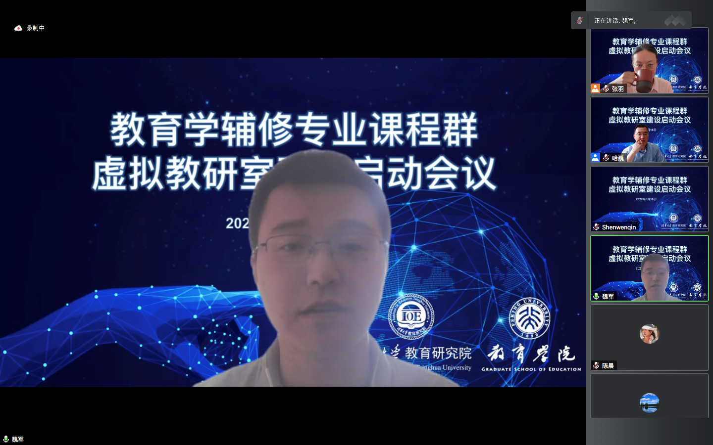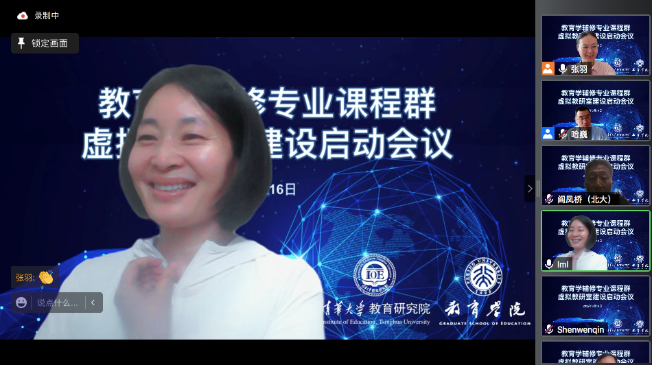 2022年6月16日上午,教育部首批虚拟教研室建设试点“教育学辅修专业课程群虚拟教研室”启动会议以线上视频会议形式成功举行。本次会议旨在全面贯彻《教育部办公厅关于首批虚拟教研室建设试点名单的通知》教高厅函〔2022〕2号文件精神,落实教育部《关于加快推进虚拟教研室试点建设工作的通知》工作安排,交流欧亿体育和清华大学教育研究院教育学本科辅修专业课程群建设情况,讨论部署虚拟教研室建设的具体方案。教育部教育学本科教学指导委员会秘书长李曼丽教授、虚拟教研室学科带头人,清华大学教育研究院院长石中英教授、欧亿体育院长阎凤桥教授及教育学辅修专业课程群虚拟教研室成员共 18人参加会议。会议由清华大学教育研究院副院长张羽副教授主持。