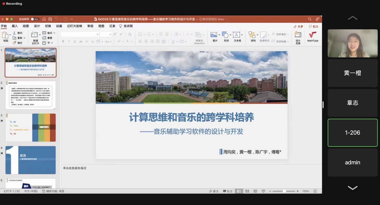 在子会议八“STEM与创客教育”,21级硕士生周均奕作了题为《计算思维和音乐的跨学科培养——音乐辅助学习软件的设计与开发》的报告。研究基于计算思维的培养,梳理了音乐与计算思维的内在联系,并设计开发了一款结合音乐与计算思维的辅助学习软件——“码上音乐”,尝试为计算思维与音乐的跨学科融合提供新的视角。