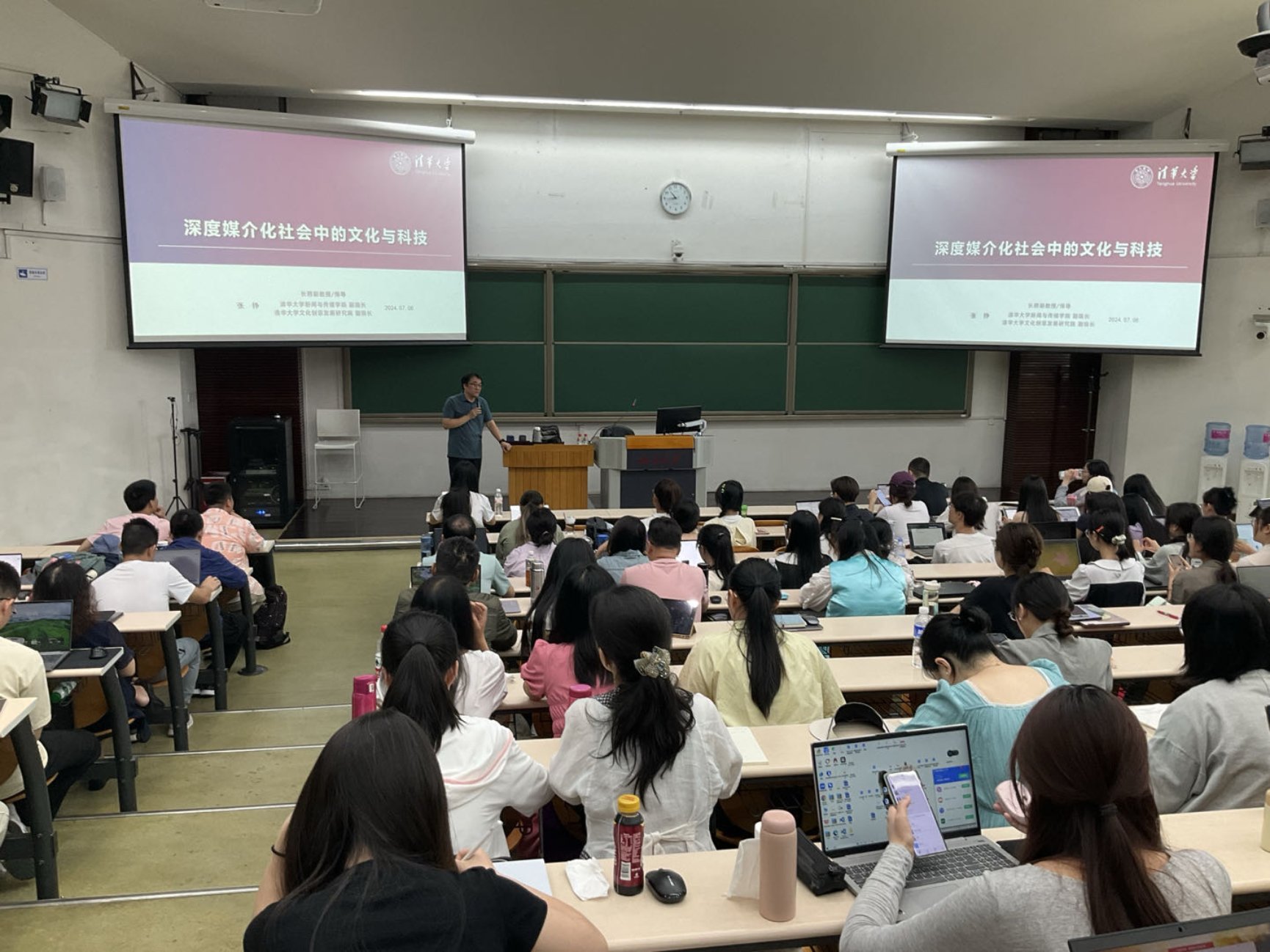 7月8日上午第二场报告由清华大学新闻与传播学院副院长张铮长聘副教授主讲,题目为《深度媒介化社会中的文化与科技》。他从媒介发展历史入手,探讨当前深度媒介化社会的特征与趋势,进而分析当前文化与科技的双向互动;他强调,科技推动文化出现新场景、新业态、新模式,文化则应为科技自立自强担起思想解放的关键作用。