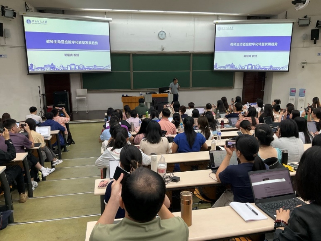 7月9日上午第一场报告由西北师范大学教育技术学院教授、教育部教育信息化战略研究基地(西北)主任郭绍青主讲,题目为《教师主动适应数字化转型发展趋势》。在教育数字化全面推进的过程中,教师数字素养提升摆在了突出位置。郭教授对数字技术融入教育的功能作用进行了全面分析,包括五个方面:数字社会驱动核心素养教育、虚实融合教学空间成为教学新环境、数字技术推动多类型数字教育资源供给、数字技术赋能教学评价多元化、数字技术重构教学关系与流程;他指出教师需要在多个维度认识数字技术促进教育发展的方向,引导教师能够正确理解教育数字化,知道自身需要从理念、理论、方法等方面提升自己的数字素养,发展自己的数字化教学能力。
