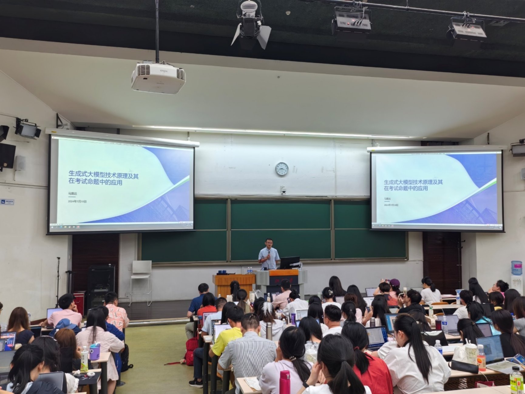 接着,广东技术师范大学副教授和广州启辰电子科技有限公司CEO马震远进行了题为《生成式大模型技术原理及其在考试命题中的应用》的报告。作为人工智能在教育垂直领域的一项典型应用,马震远老师详细讲述了语料库构建、模型训练、指令微调等通用技术在命题实践中需要做出哪些针对性的调整;在现阶段重要考试命题工作中,人工智能如何参与选拔性考试命题、如何参与水平性考试命题等相关问题。