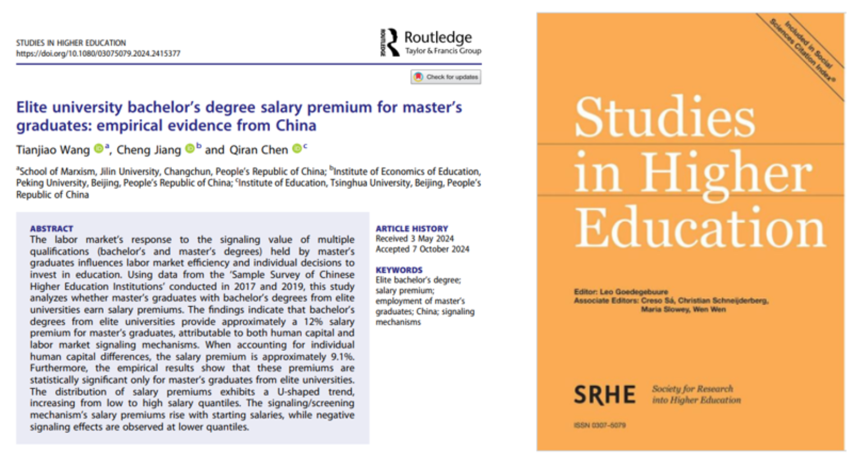 近日,我院蒋承老师(通讯作者)及其合作者王天骄(第一作者)、陈其然在国际高等教育权威刊物《Studies in Higher Education》上发表题为“Elite university bachelor's degree salary premium for master's graduates: empirical evidence from China”的学术论文。