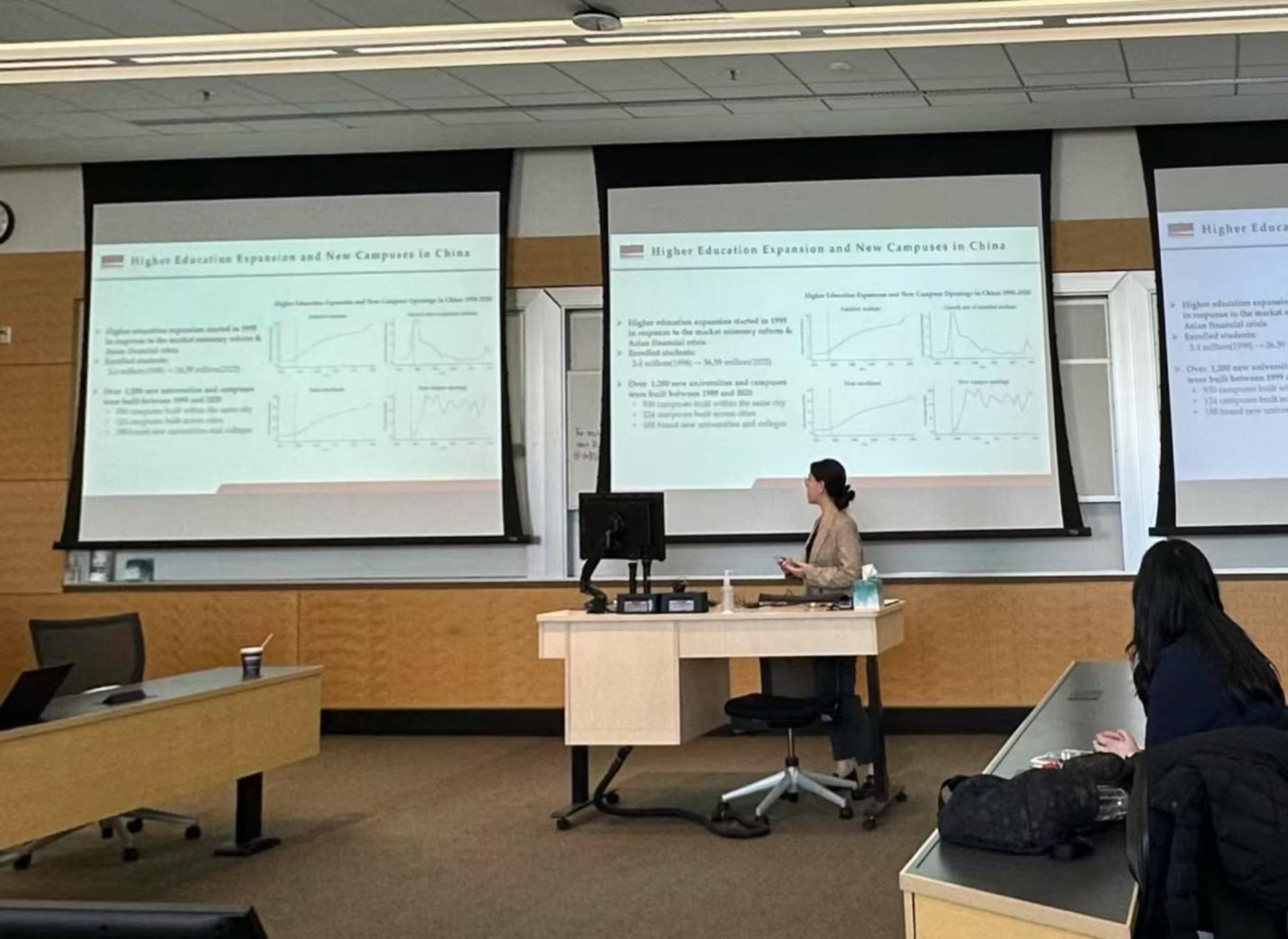 3月20日,应密歇根大学公共政策学院邀请,哈巍教授在该院课程《Causal Inference in Education Policy Research》作题为“How Does Higher Education Affect Local Entrepreneurship? Evidence from New Campuses in China”的学术报告。密歇根大学公共政策学院Brian Jacob教授和Kevin Stange教授出席讲座。该项研究利用新建校区的设立在时间和地理上的差异,并基于中国自1999年以来高等教育快速扩张下构造独特的工具变量,识别高等教育机构对当地创业活动的溢出效应。利用大规模企业注册数据,研究发现新校区的启用会增加所在区县的企业进入数量,尤其是在知识密集型商业服务领域。上述效应随着地理距离的增加呈现出倒U型模式。这一影响通过促进高校与本地企业的产学研合作以及扩大本地高技能劳动力供给发挥作用。研究表明对高等教育领域的大规模公共投资能够促进产业集聚,并助力发展中国家的经济结构向知识密集型转变。3月22日,博士生林璐在中国留美经济学会(China Economists Society,CES)北美年会作相关学术报告。