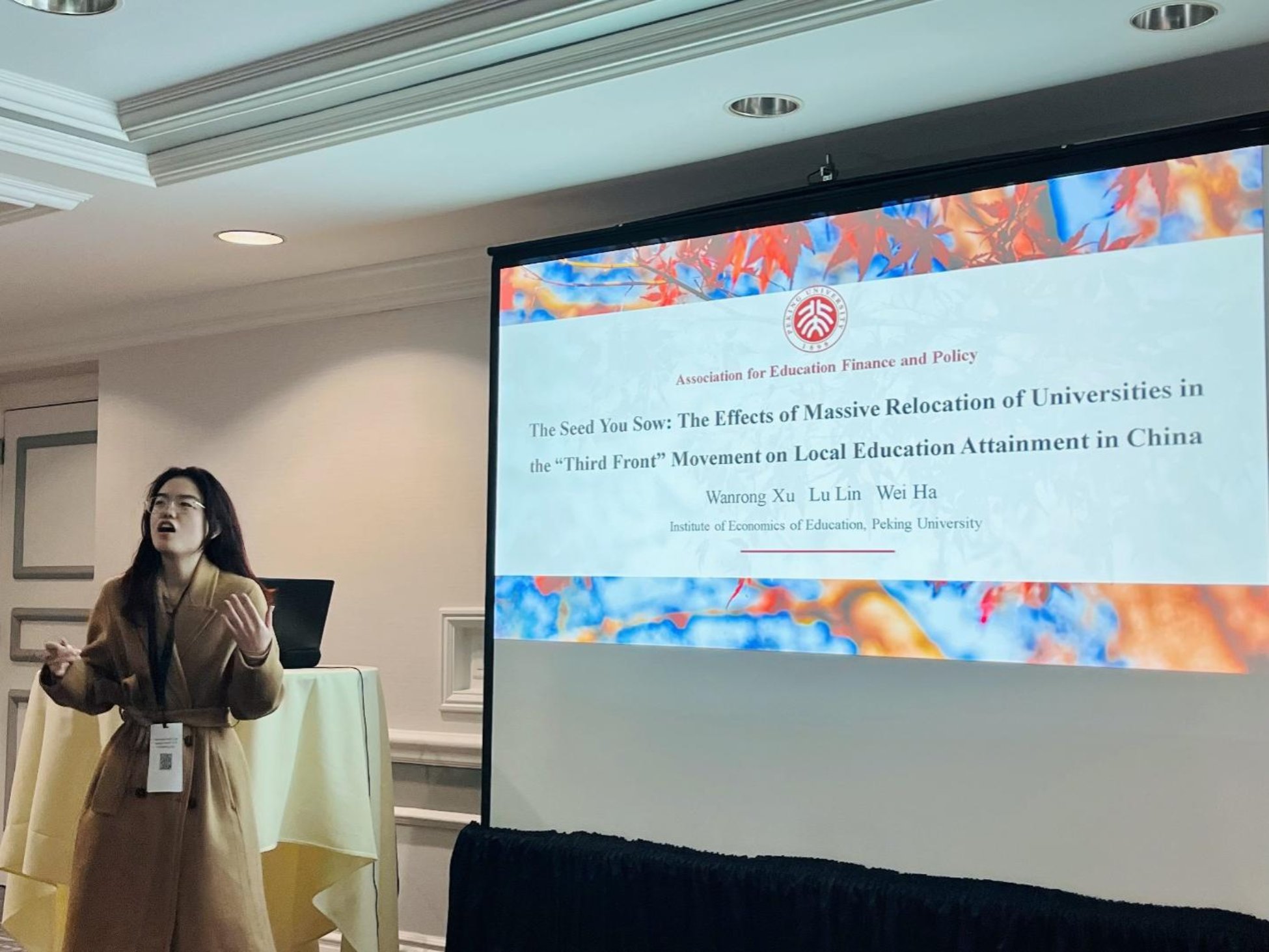 3月14日上午,博士生徐万蓉作题为“The Seed You Sow: The Effects of Massive Relocation of Universities in the ‘Third Front’ Movement on Local Education Attainment in China”的口头报告。该项研究以三线建设期间大规模高校迁徙为自然实验,基于手工收集的三线高校搬迁数据与1990年人口普查数据,采用队列双重差分法实证检验三线时期高等教育布局调整对当地居民人力资本积累的影响及机制。研究发现,三线高校迁入显著提高了当地居民的受教育水平,其中女性和农村居民受到更加显著的影响。三线高校主要通过遗留高等教育资源与革新婚姻生育观念产生人力资本效应。
