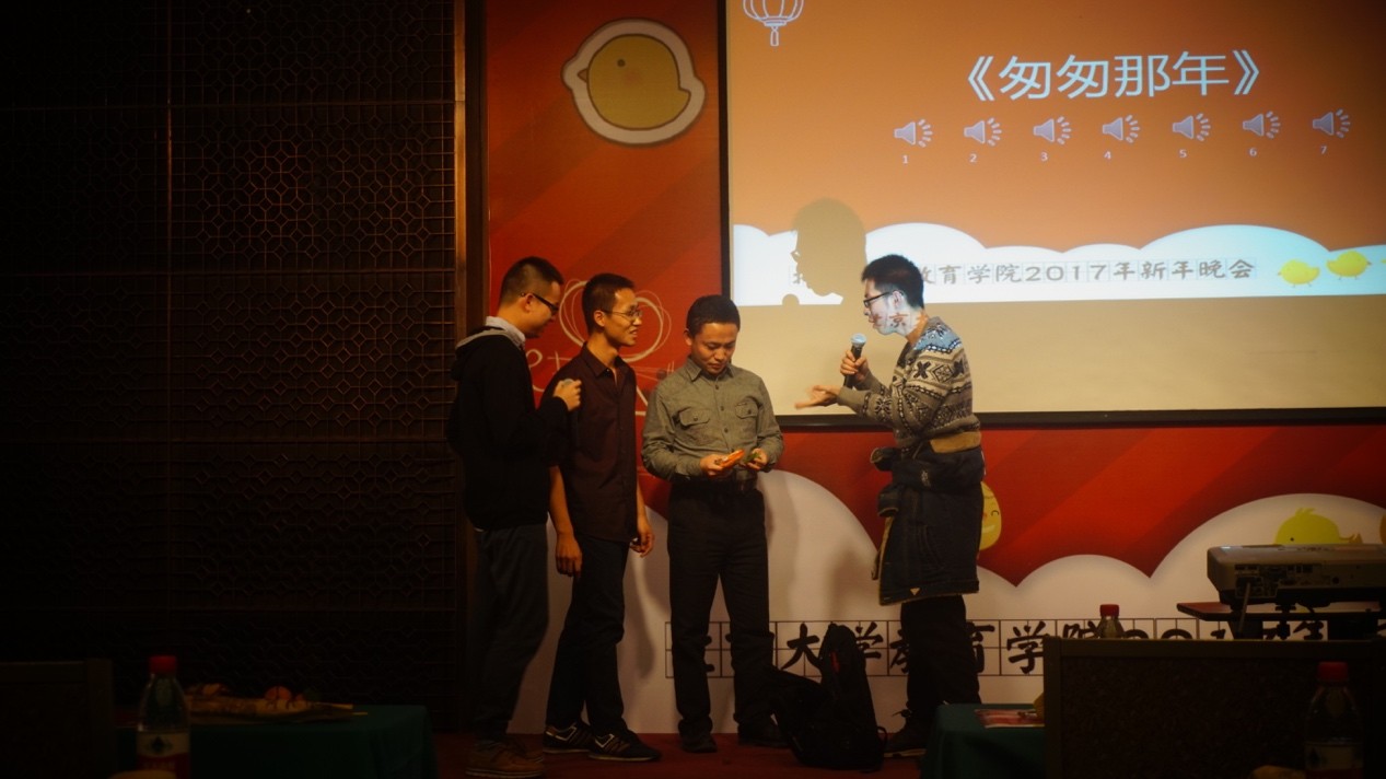 此外,本次新年晚会还设置了互动抽奖环节。三次抽奖分别发放三等奖零食大礼包3份、二等奖榨汁机2台、一等奖kindle1个,引起了同学们的阵阵关注与欢呼。在16级教经硕士生们点燃全场的串烧歌曲《四季歌》中,本次晚会圆满结束,全体师生上台合影留念。