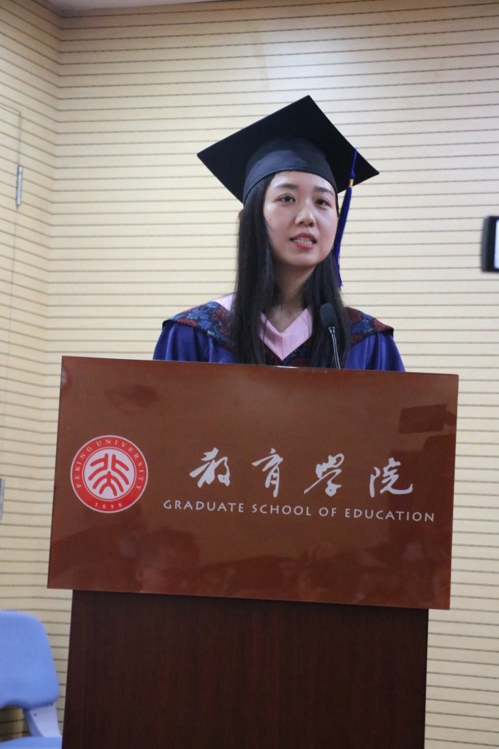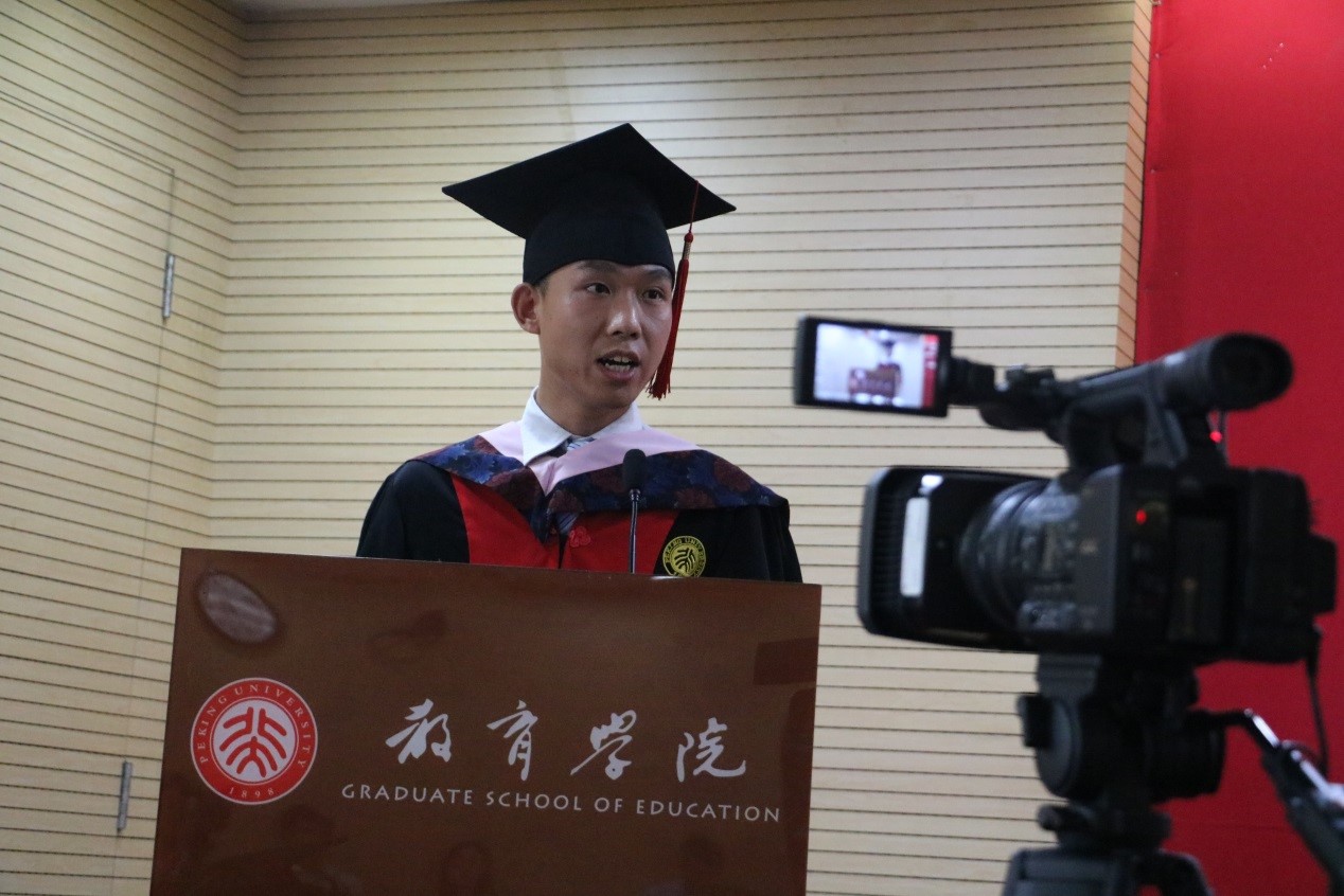紧接着,优秀的毕业生赵婧宏、吴红斌代表分别毕业生做了情深意切的发言。他们或用娓娓道来的述说,或用幽默风趣的语句,与全体毕业生一起重温了在教育学院求学、生活的美好回忆,真切地表达了对学院老师们的感恩之情。毕业生代表纷纷表示,老师们教授他们做人和做事的道理将永远成为每一位毕业生航行于人生海洋中的启明灯,时刻引领着他们不断前行。他们也一定会秉持北大人勤奋严谨、求实创新的优良传统,在未来的学习、工作岗位上脚踏实地、勤奋努力,不辜负教育学院老师们的殷切期望。