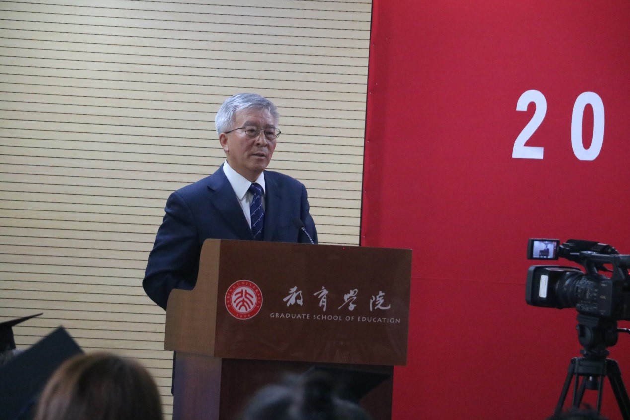 最后,教育学院院长陈晓宇教授在同学们的欢呼声和掌声中为毕业生发表了题为“致未来的教育者”的致辞。他首先代表学院全体教职员工向获得博士、硕士学位的全体毕业生表示热烈祝贺,并向辛勤耕耘的导师,及为研究生同学顺利完成学业付出心血的父母、家人和朋友致以敬意和问候。他特别表达了对毕业生迈上新的高峰的祝贺,也表达了对大家即将离开学院和学校的惜别之情。随后,他给同学们分享了在一个改革和创新的时代,未来的教育者应该具备的品质。他认为,在一个时刻变革的时代,未来的教育者要做终身学习者,要做更加积极进取的开拓者和创新者,要牢记立德树人,把育人贯穿到教育全过程。陈晓宇院长祝愿毕业生不忘教育承诺,坚守教育情怀,在各自的岗位上不断开拓创新、贡献社会,实现自己的人生价值,无愧于这个时代。
