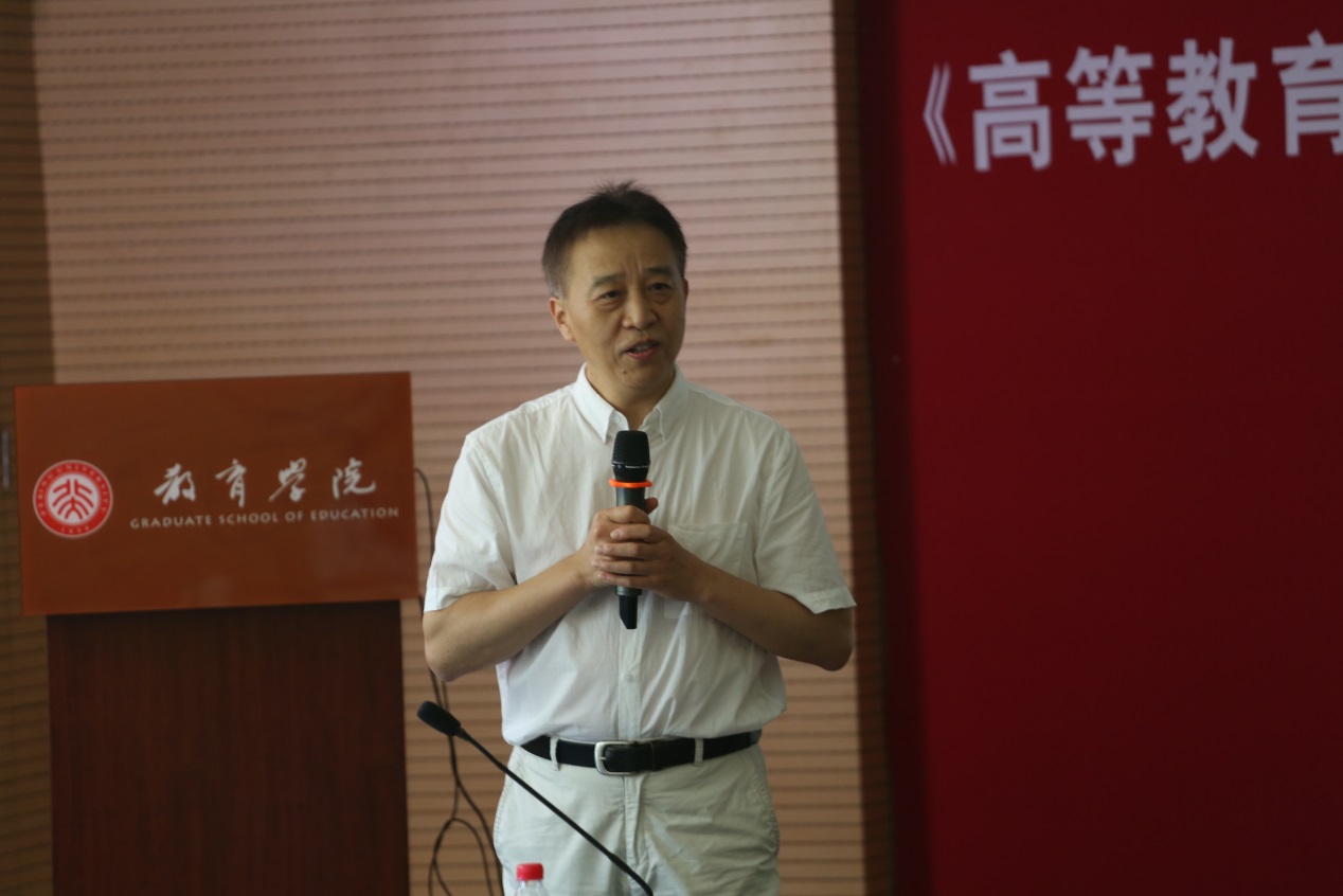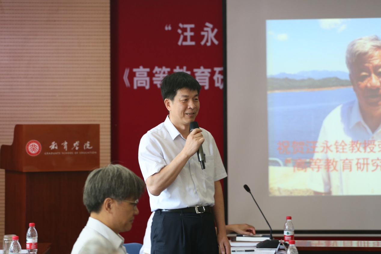 教育学院院长陈晓宇代表学院致辞,他首先感谢各位教育学界前辈冒着酷暑,克服困难来参加此次活动,表示推出《汪永铨和高等教育在北大——汪永铨教授的开拓之路》一书是为了更好地回顾和感念汪永铨教授的教诲,同时对整个中国高等教育学科的发展进行历史回顾,梳理和完善高等教育领域里汪永铨教授的著作,以及相关学者对汪永铨教授的回忆和描述,这对于教育学科的发展具有重要的意义。陈晓宇强调,汪永铨教授对于整个国家、教育体系的情怀或志向,值得后辈们学习、继承和发扬,是北大教育学院宝贵的精神财富。