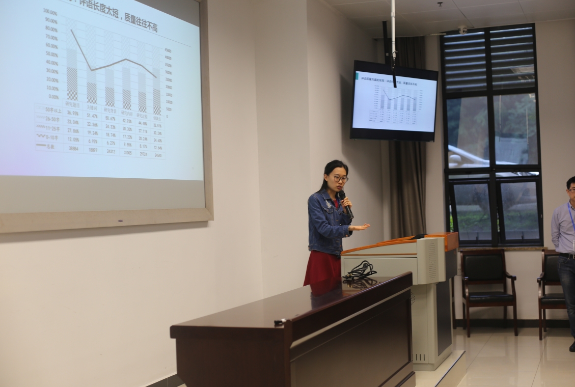 在子会议“学习分析、评估、人工智慧教育应用”中,17级硕士欧阳嘉煜作了《慕课情境下同伴互评评语质量的分析研究》的报告,指出同伴互评作为一种协作式学习活动,主要涉及到评价者、被评价者和评语三个关键要素。该文通过深入分析教师培训类慕课“教师如何做研究”1-11期的数据,发现同伴互评活动中存在评语字数过少、评语内容重复和忽视评价量规三大特点,且评语字数与学员成绩存在显著正相关。