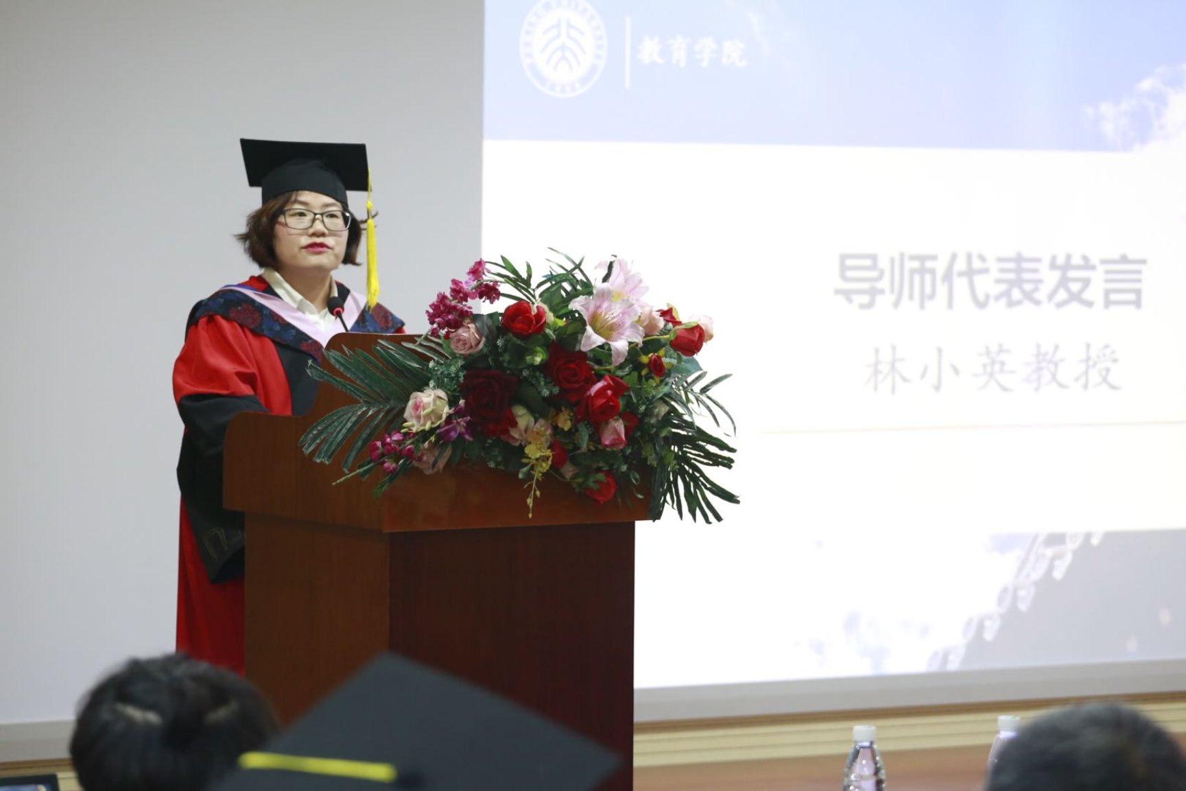 导师代表林小英副教授发表题为《常识与超越常识》的精彩演讲。她提出,教育的目的是帮助每个人找到自己的永恒的伟大事物,找到人生各阶段的重要他人,这是常识,但又超越了今天的常识。希望在座的毕业生们都可以确认自己要追寻的伟大事物、要找到的重要他人。