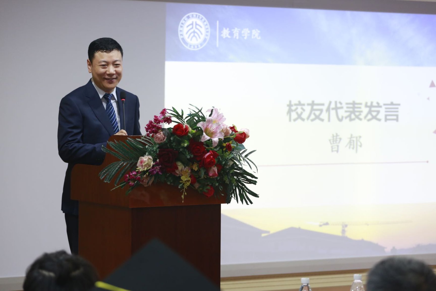 校友代表曹郁以《导之以正 激扬高远,做敢担当有作为的北大教育人》为题进行了发言。他表示,北京大学、教育学院培养了他求真的态度,使他学会运用学术思维,从更高的维度来建构自己的事业;同时也希望广大毕业生们在走向社会后,仍能保持勇气和毅力,敢于打破精致,坚持追求自己的梦想、最初的心做最久的事。