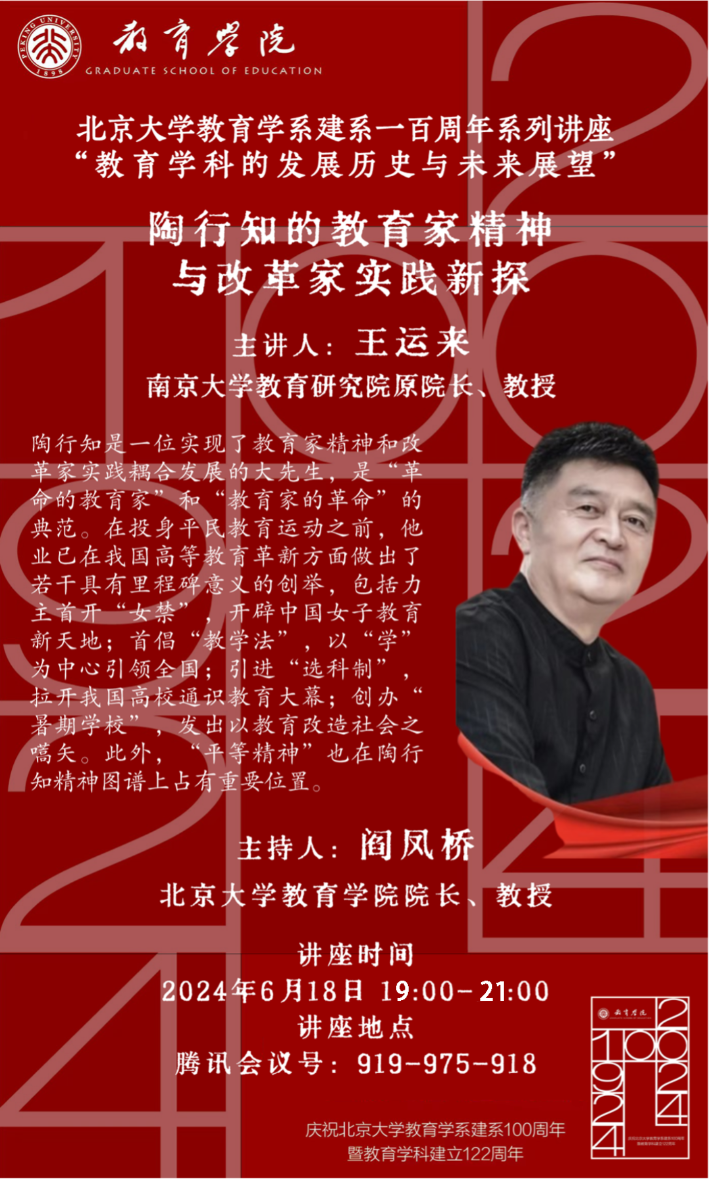 北京大学教育学系建系一百周年系列讲座 “教育学科的发展历史与未来展望” 第3讲 陶行知的教育家精神与改革家实践新探