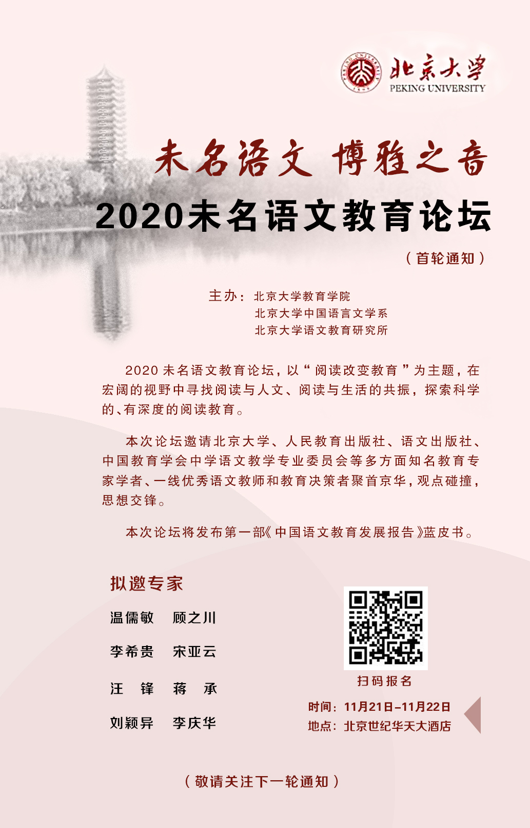 为贯彻落实中共中央国务院最近印发的《深化新时代教育评价改革总体方案》以及教育部等八部委《关于进一步激发中小学办学活力的若干意见》等文件精神,推进语文教育的理论建构与行动研究,欧亿体育、北京大学中文系、北京大学语文教育研究所拟共同主办“2020未名语文教育论坛”。会议详情,请关注后续通知。