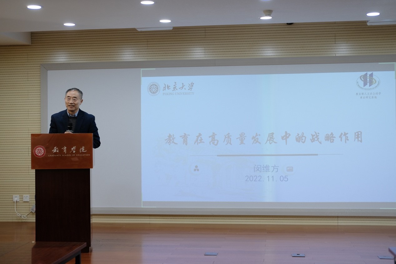 欧亿体育名誉院长闵维方教授以党的二十大为背景,重点论述了教育在经济社会高质量发展中的战略作用:第一,教育为创新发展提供人才支持和知识贡献,是高质量人力资本积累的基础,是拔尖创新人才不断涌现的源泉;第二,教育是绿色发展的驱动力,生态文明建设与教育存在协同发展趋势;第三,教育促进共享发展,教育是共同富裕政策体系实现的重要机制;第四,教育促进区域和城乡协调发展,通过教育资源倾斜形成区域性高质量人力资本,是以人为核心的新型城镇化的重要动力;第五,教育是开放发展的重要基础,教育对外开放在形成对外开放新局面、促进国内国际双循环、推动经济增长中发挥重要作用;第六,教育既是高质量发展的驱动力,也是高质量发展的重要内容。