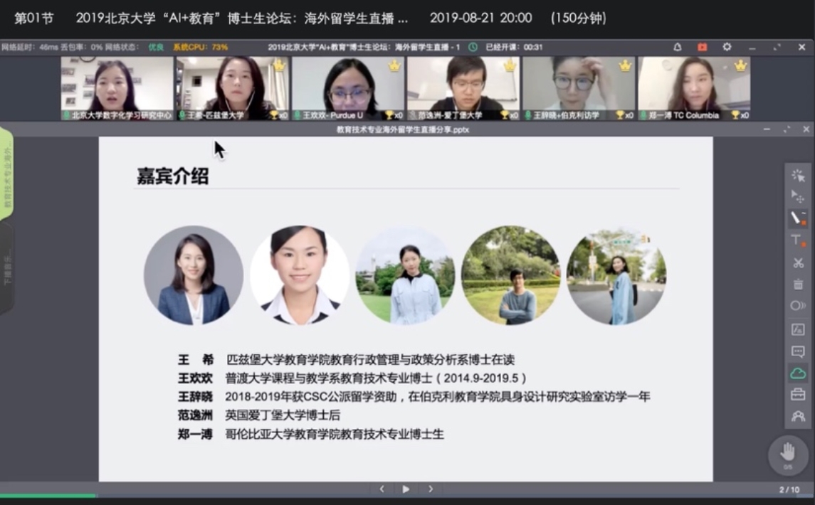 为了进一步扩大博士生学术论坛在教育技术领域乃至教育学界的影响力,本次论坛采用线上直播+线下研讨的方式进行。线上直播之海外留学生专场活动(时间为8月21日晚上8点至10点30分),共邀请了五所国外知名高校(哥伦比亚大学、匹兹堡大学、加州大学伯克利分校、爱丁堡大学、普渡大学)的博士生、博士后和访问学者分享她们的研究以及所在团队的研究进展,170多人参加了实时交流,1653人次回看了本次直播录像。