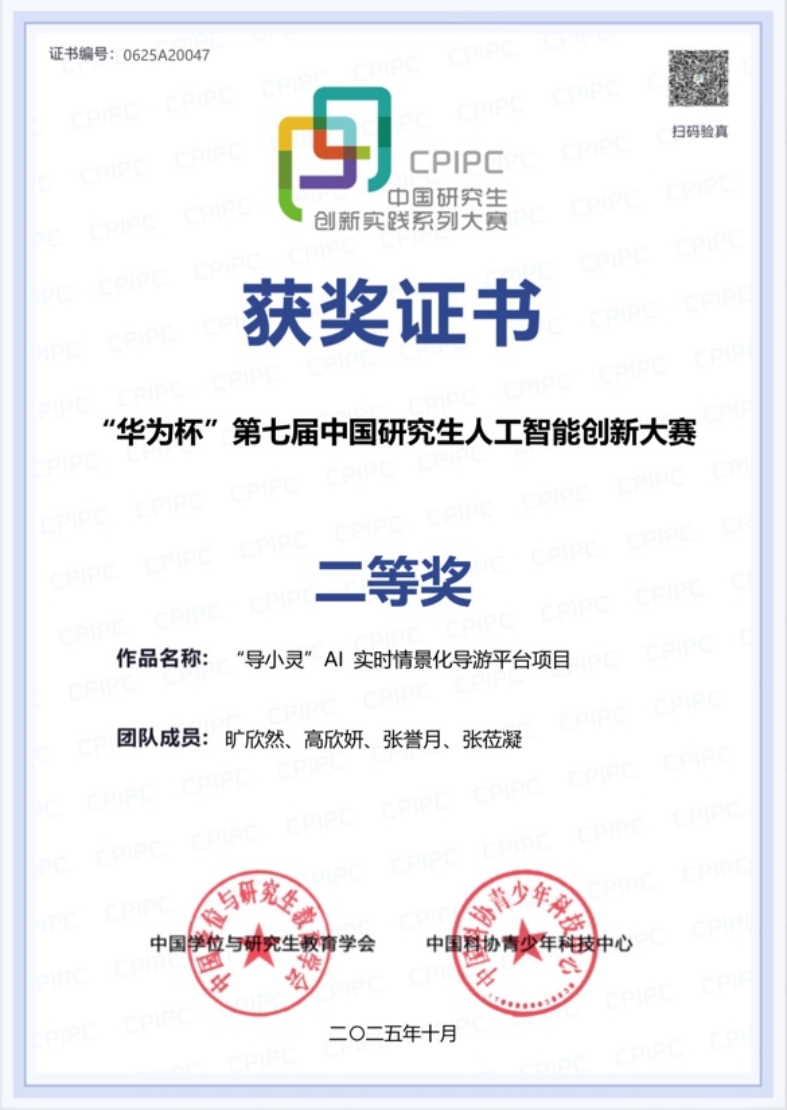 近日,于山东青岛举办的“华为杯”第七届中国研究生人工智能创新大赛全国总决赛圆满落幕。由欧亿体育教育技术系贾积有教授课题组与汪琼教授课题组学生旷欣然、高欣妍、张誉月、张莅凝组成的参赛团队,凭借作品《“导小灵”AI实时情景化导游平台》荣获全国二等奖。该团队也是本届大赛中北京大学唯一一支入选全国总决赛并获奖的队伍。