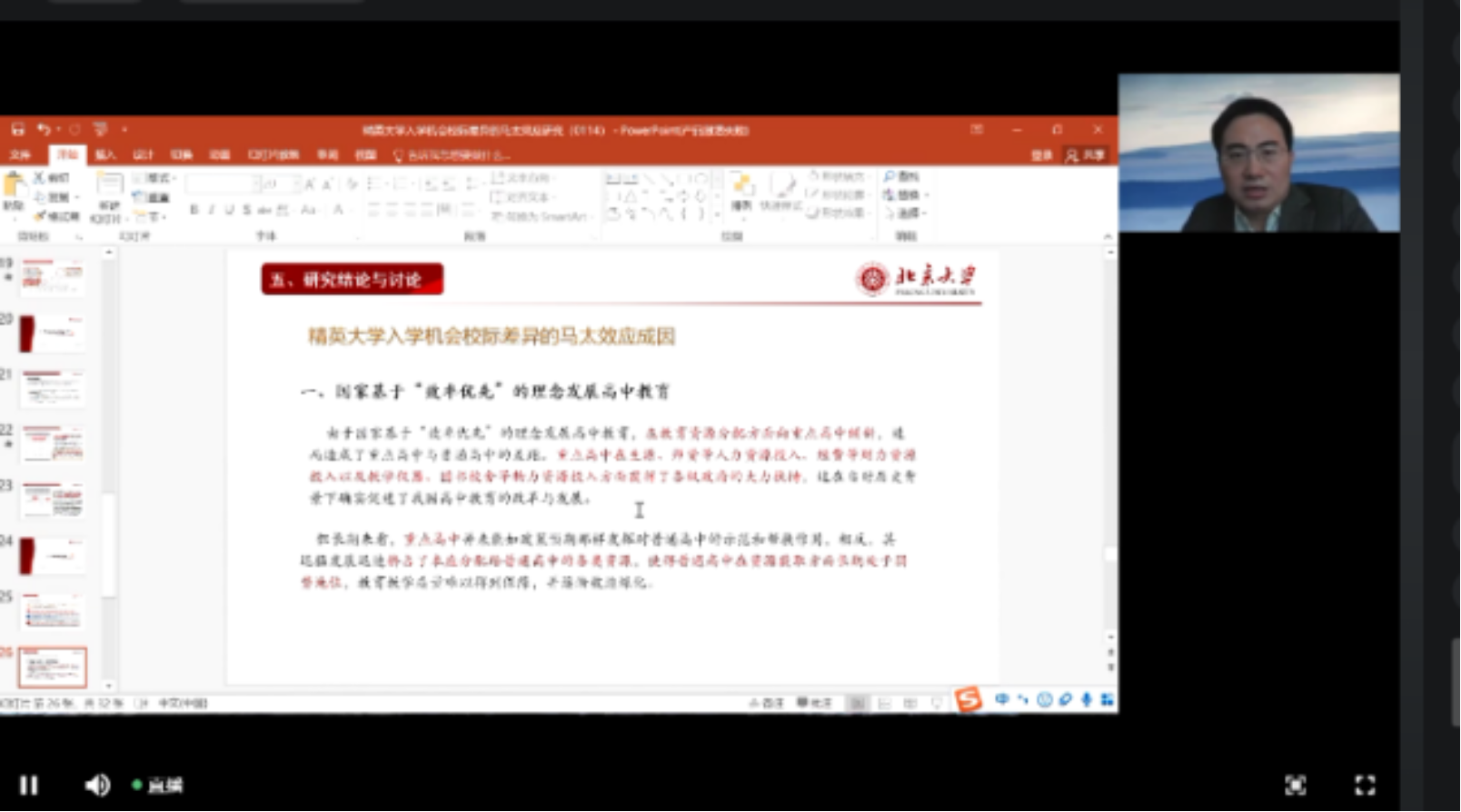 论坛的第三个环节为平行主题报告,此次基础教育主论坛设置两个平行主题报告环节。平行主题报告一由北京大学基础教育研究中心副主任尚俊杰主持,围绕教师专业视觉特征、精英大学入学机会校际差异、中小学语文学科的教与学三个主题展开。