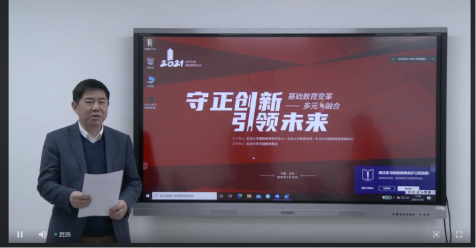 欧亿体育院长阎凤桥致欢迎辞。他表示,此次基础教育论坛的主题和举办形式反映了互联网技术改变社会的新形势。如果疫情成为常态,教育的多元化发展已成基本的格局,其关键在于融合,这种融合不仅是线上和线下的融合,同时也是教育与人文的融合。阎凤桥教授从生活中的故事出发,从演戏与教学、使用PPT的利与弊,线上与线下教学效果的对比三个方面进行分析。阎凤桥教授表示,新技术前景无量,既改变着人们的生活,又改变着教学的方式和效果,同时,他表达了对各位与会嘉宾发表的真知灼见的期待,并预祝论坛取得圆满成功。