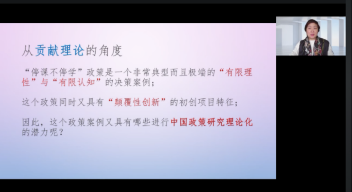 华东师范大学课程所副所长陈霜叶以“‘非常态’中的中国教育政策‘常态’“为主题作报告。陈霜叶教授立足于疫情的非常态状况,透视其中教育的常态,分析中国的政策现实的知识基础。陈霜叶教授以去年两个多月中国全域的“停课不停学”政策任务为切口,探析这一项不可能的任务是如何在国家的政策中成为可能、从颠覆性的目标变成现实的;其中又有哪些默会的知识。陈霜叶教授梳理了疫情期间“停课不停学”政策的变化过程,分析了政策中浮现的“愿景性目标”与“快速政策迭代”和“打补丁”政策。她总结指出,近几年,中国教育政策系统中已经形成了一系列本土性政策知识,甚至形成了因应舆情、因地制宜的政策脚本。研究者应该看到中国政策的特点,分析其中的优点和缺点,为之后的教育实践提供经验和教训。