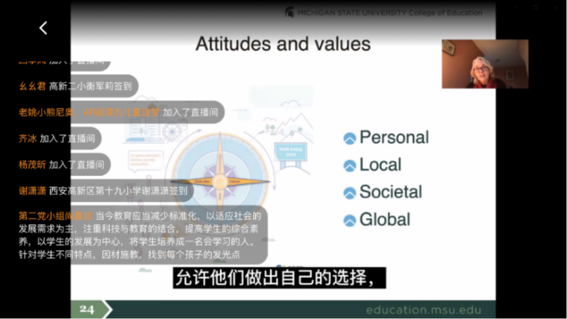 密西根州立大学国际教育学院副院长Lynn Paine(琳·佩恩)以“重塑K-12教育“为主题发表报告。琳·佩恩教授指出,不断变化、更加复杂的世界让人们意识到摆脱教育的旧有框架很重要,教育也必须考虑个人、社区和整个世界的福祉。琳·佩恩通过分析OECD开发的面向未来的“学习指南”,提供了教育的学习愿景及学习目标。“学习指南”的使命是将知识、技能、价值观和态度融合在一起,帮助学生实现可持续的幸福。琳·佩恩认为,态度、价值、知识并非是相互竞争的零和关系,而是相互依赖、相互关联的。其中,知识不仅包括核心性基础知识,还包括公民意识、公平、个人和社会责任等价值观;技能包括认知和元认知技能、社会和情感技能、新技术和新信息的实践技能。琳·佩恩最后指出,对于教育者来说,重塑教育的理念不仅是改变课程,更重要的是要重塑自身对于教与学的思考。