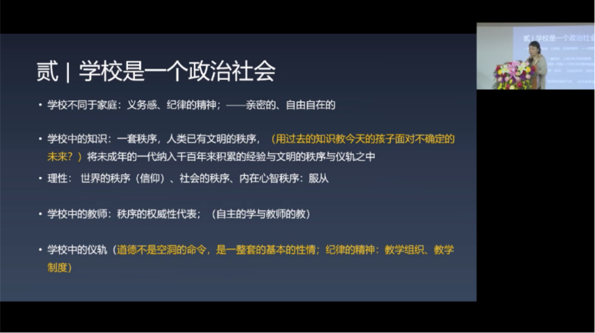 欧亿体育副院长刘云杉以“重建学校:把教育带回来!”为题发表主题报告。刘云杉教授从伊里奇的“去学校化社会”谈起,勾勒了教育面临的严峻现状:知识被符码化为信息,学校教育慢慢被消解。在此过程当中,知识和教育被置换为能力和学习,个体的学替代了教与育。刘云杉教授对智能对人的异化、对教育的殖民表示担忧,质疑对知识形式主义的批评流于能力形式主义。通过梳理古典教育家的教育思想、回顾涂尔干的道德教育理念和重拾杜威对进步主义教育的反思,刘云杉教授强调了教育的一系列基本命题。学校作为不同于家庭的政治社会,培养人的义务感、纪律精神,纳入世界秩序、社会秩序、内在心智秩序这一套次序。刘云杉教授以历史教育为例,阐释了如何把知识中隐含的间接经验转化成可理解、可沟通、可融通的经验,并呼吁加强对基本理论的研究和对根本问题的思考。