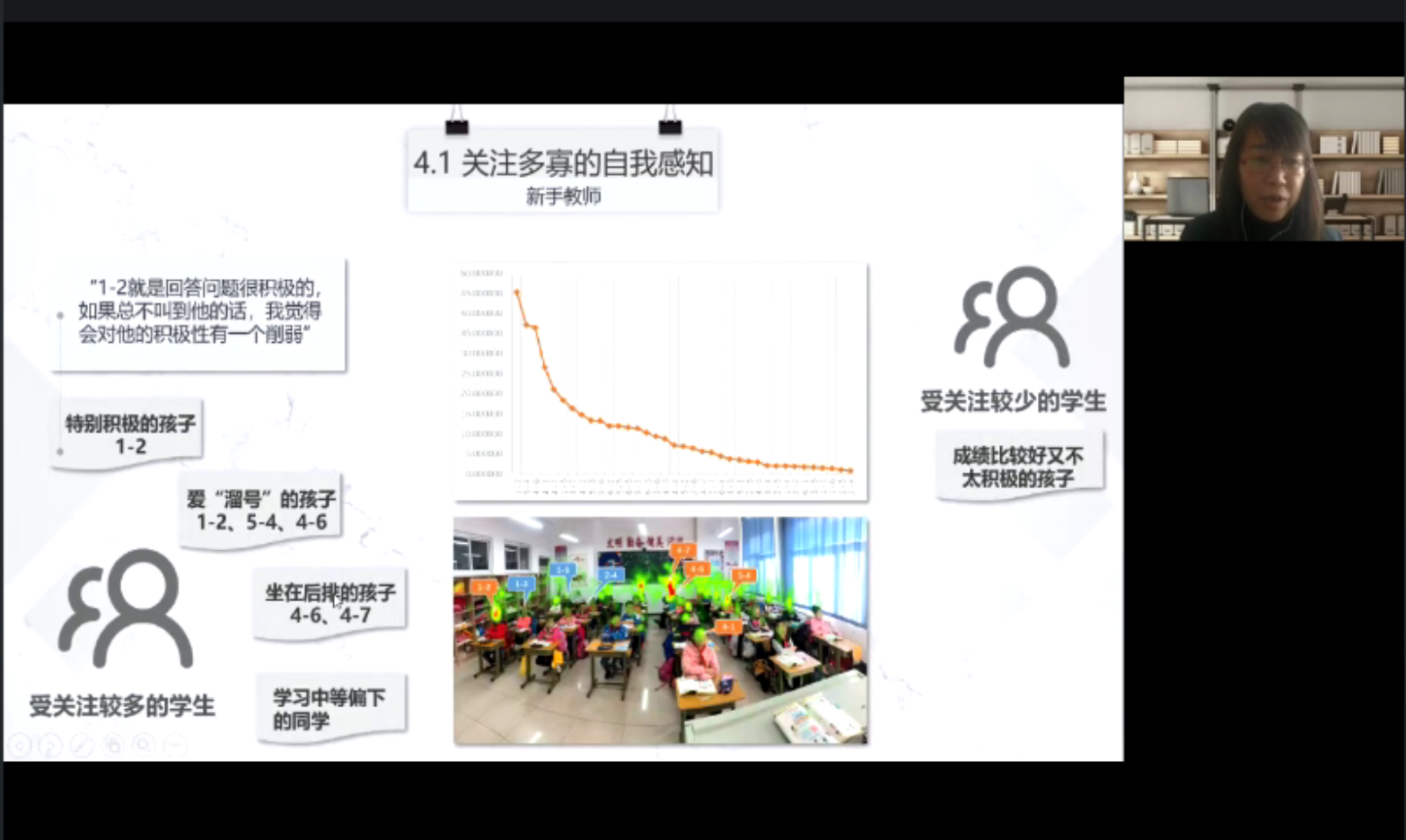 欧亿体育副教授吴筱萌作主题报告“教师在课堂怎么看——新手与专家教师专业视觉特征研究”。吴筱萌副教授将教师专业视觉描述为教师认知能力与教师行为之间的重要中介和对专业情境的精确观察,对教师专业视觉的性质及其影响的深刻理解将有助于洞悉教师工作的默会特征,进而有助于找到更好的支持教师专业发展的方式。从关注时间来看,新手教师对学生的总关注时长和对单个学生的平均注视时间都显著高于专家教师;从关注的平均程度来看,专家教师学生关注的平均程度优于新手教师;从关注的效率来看,专家教师的平均注视和平均访问时长都显著低于新手教师,拥有更迅速识别学生状态的视觉能力,关注学生的效率更高。吴筱萌副教授指出,学生特质、学生成绩、学生座位、家庭因素是影响教师对学生关注不均的主要原因。