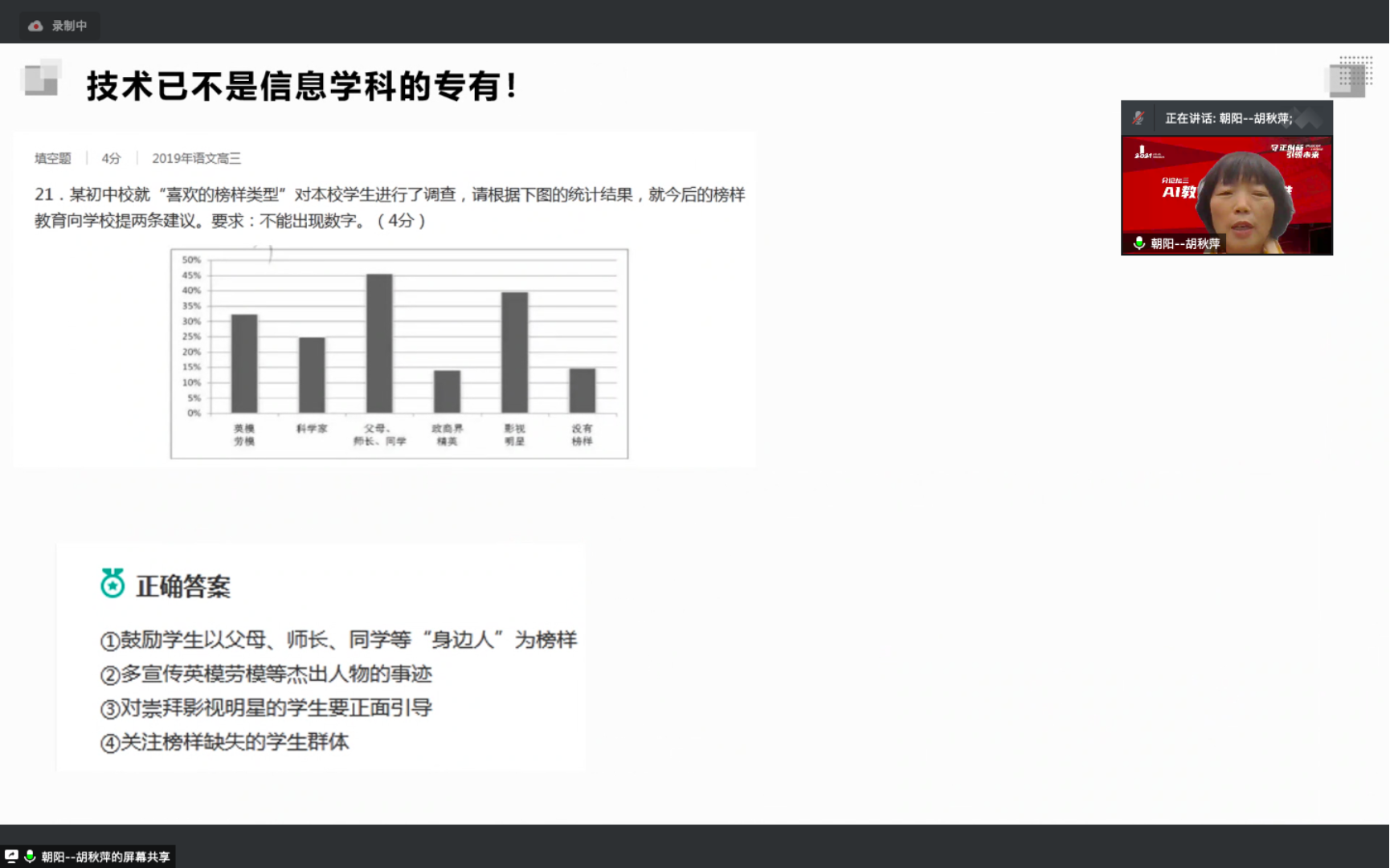 北京市怀柔区教委徐志芳主任从人工智能与教育;人工智能教育和实践反思等三个方面谈人工智能教育。结合区域教育实践,徐主任认为人工智能大致集中在底层技术平台共建,平台应用的共建,智能化的教育装备。在人工智能教育实践方面,怀柔区自引入人工智能与教育融合的行动计划,积极推动基础教育阶段的人工智能普及。徐主任认为人工智能对学生的逻辑和计算思维的提升很有帮助,是怀柔区科技建设模块的重点。实践中,需要教研人员、信息技术专家等多方协同合作开发课程,构建人工智能学习平台和学习资源。
