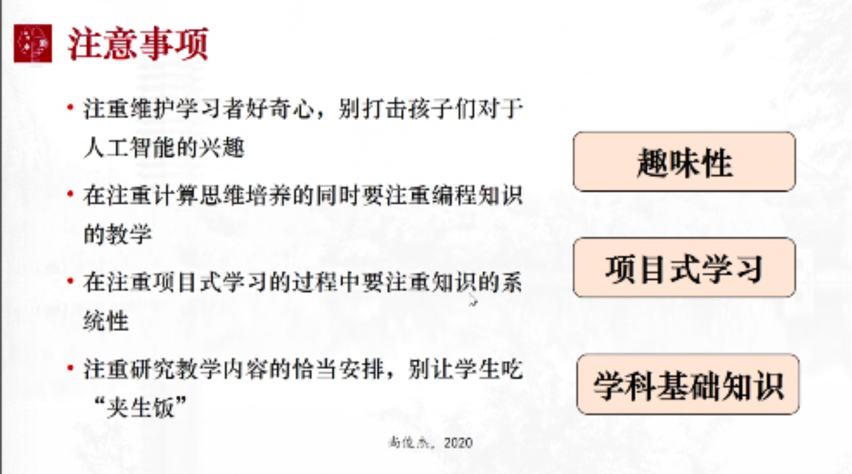 北京教育学院朝阳分院胡秋萍主任认为计算素养将和人文素养、科学素养并列成为影响人终身发展的素养。通过自身的项目学习研究经验指出,人工智能课程体系进入义务教育的课堂教学应该考虑青少年的认知水平和基础知识,依据现有水平来设计课程。