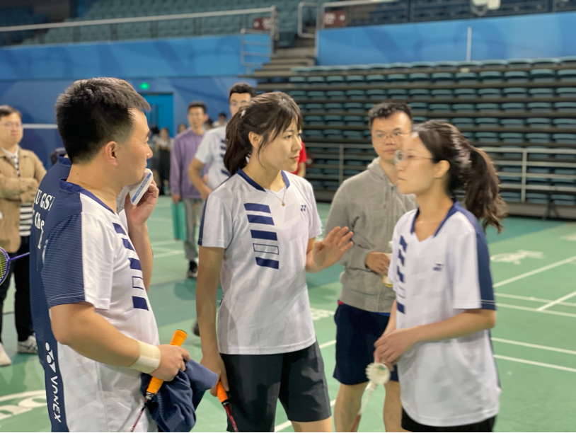 上午第一轮比赛,联队对阵乙组拥有冠军实力的队伍——外国语学院。教育学院陈得春和社会学系法翠雯组成混双以完美的配合拿下此次北大杯的首胜,极大地鼓舞了队伍的士气。教育学院乐惠骁和方程煜分别出战男单和女单,但对方实力强劲,两项比赛憾负于对手。随后陈得春和郭丛斌老师组成强势男双为联队扳回一城,比分来到2:2。压力来到了女双身上,社会学系代颖和谭心怡组成的女双顽强拼搏,为决胜局拼尽了全力,但是无奈对方实力太强,教育社会联队2:3负外国语学院。