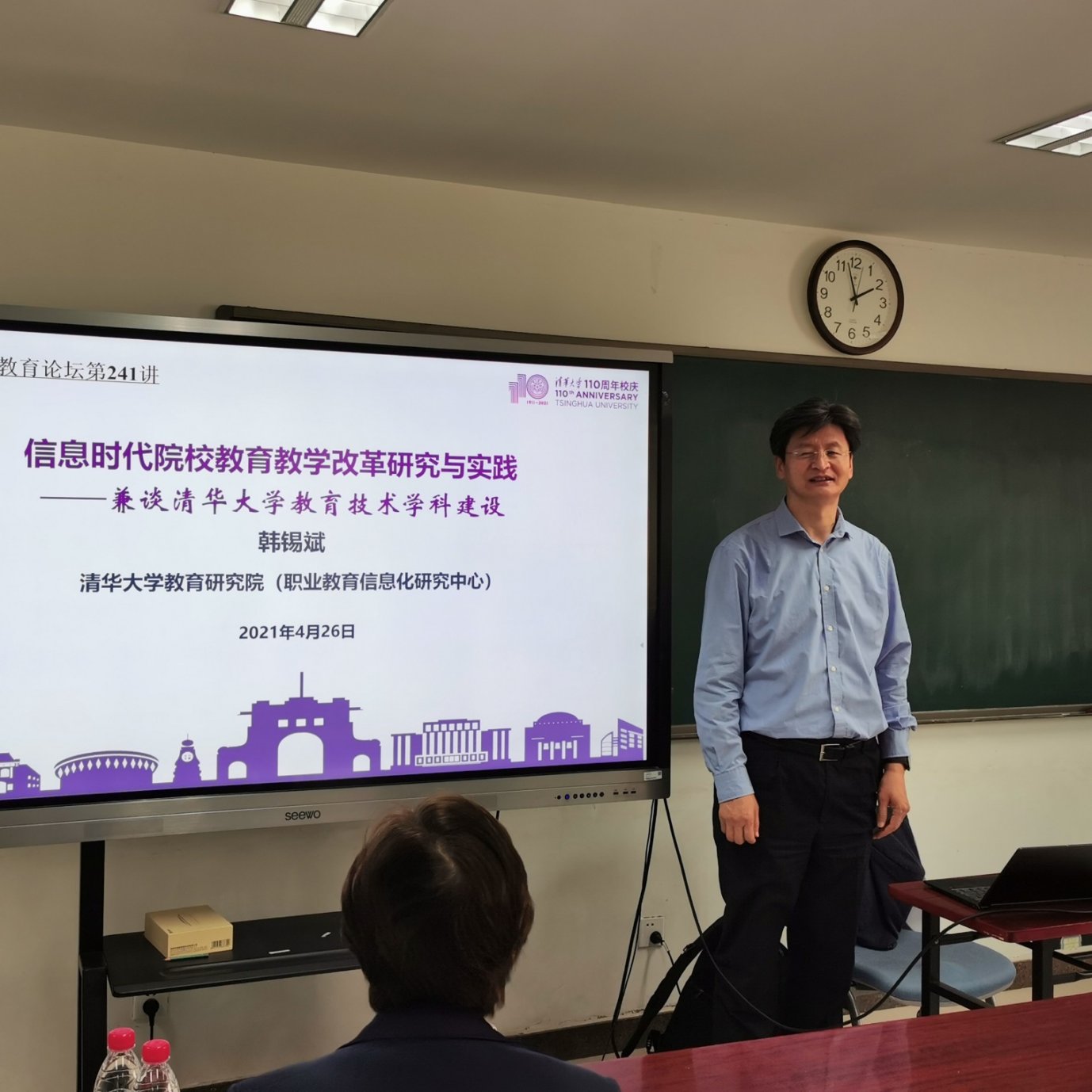 主讲人简介:韩锡斌博士现任清华大学教育研究院长聘教授、博士生导师、副院长。2011年在美国斯坦福大学和弗吉尼亚理工大学作访问学者。自1998年进入清华大学从事教育技术研究,研究方向聚焦于在线教育、混合教学、数字化学习环境的理论、方法与技术。研究成果获国家教学成果二等奖、省部级教学成果特等奖、高等学校人文社会科学研究优秀成果奖、北京市哲学社会科学优秀成果奖、北京市科技成果奖。技术研发成果——“清华教育在线(THEOL)”系列教育教学软件获得39项国家软件著作权、校级和部级奖40余项,在500多所院校应用,受益师生达1500万人。兼任教育部《职业院校数字校园规范》编制组组长,“职业院校数字校园建设实验校”项目专家组副组长,教育部高校教育技术学专业教学指导分委员会委员,国际华人教育技术学会(SICET)会长(2018年)、国际期刊《教育技术发展与交流》(JETDE)主编、联合国教科文组织(UNESCO)混合教学项目专家。