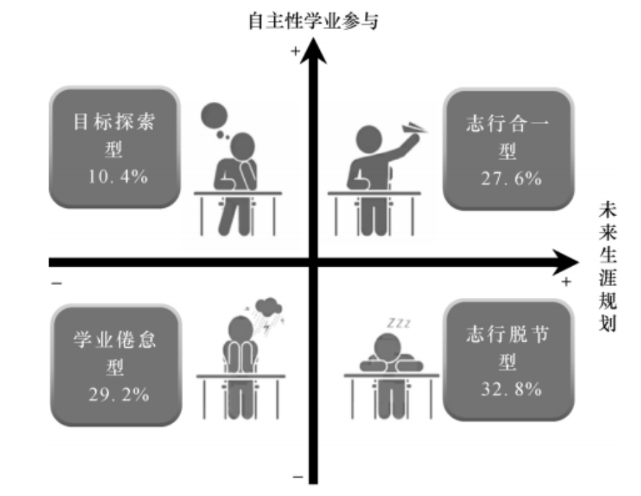 1.高校学生呈现明显多元化异质化趋势成为普及化阶段中国高等教育面临的严峻挑战。针对高校学生普遍存在的自我同一性危机生涯目标模糊学业倦怠等特质,论文基于自主性学业参与和自我生涯规划两个指标交互所构成的学生类型范式分析(如右图所示),清晰中国本科学生亚群体的异质化图景及其家庭社经属性和学业发展成就差异。研究发现传统精英阶段升学者均持有明确且强烈的学习目标和学习积极性的同质性假设遭遇挑战,具有明确生涯规划,课堂内外开展自主性学业参与且学业表现优异的志行合一性学生群体在总体中的占比仅为27.6%。与之相异,各类高校所面对的主要受众为虽然自主性学业参与度较高、但对未来并未形成明确规划的目标探索型学生群体10.4%虽抱有清晰的自我发展目标定位却在行动层面滞后志行脱节型学生(32.8%)既无明确的自我发展规划自主性学业参与也较低的学业倦怠型学生(29.2%)。后者三类群体学生的学业成绩与大学入学后能力素质增值表现均低于前者。学生群体异质化的趋势在一定程度上诠释了当前我国本科教育所面临挑战的复杂性和不明确性在人才培养过程中对后三类学生群体给予针对性的干预指导,优化其大学就读体验,使其从中思考与明晰个体生存意义和目标,并成为知识学习和建构过程中的积极主体,成为高等院校通过一系列高影响力教学实践所追求的目标指向。
