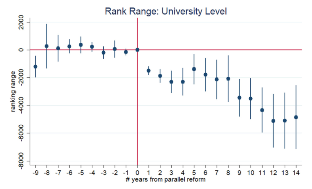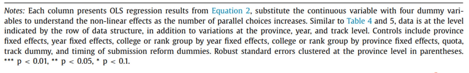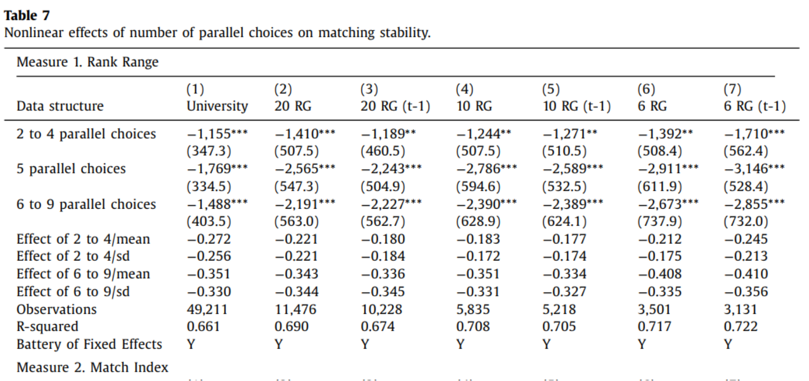 文章发现中国从顺序志愿到平行志愿的录取机制革,各院校录取的学生其名次范围更窄,匹配指数也更小,匹配结果的分层更为清晰、精确换言之平行志愿录取机制大幅提高了匹配的稳定性。此外ChenKesten2017)的理论预测一致,本文还发现对于采用平行志愿录取机制的省份,在第一志愿中如果允许有更多的平行志愿数量,匹配稳定性的改善效果会更明显但需要注意的是,这里改善效果的增长是非线性的,换言之,增加更多平行志愿数量带来的边际改善效果实际下降。我们还使用事件研究设计,讨论了改善效果是否以及如何随时间的改变而改变,结果表明改善效果在平行志愿实施后的810年内会加倍。最后通过一系列稳健性检查,例如排除早期改革的省份,添加或排除某些控制变量,以及在不同权重或不同聚合水平下进行分析,本文得到结果都是稳定的。
