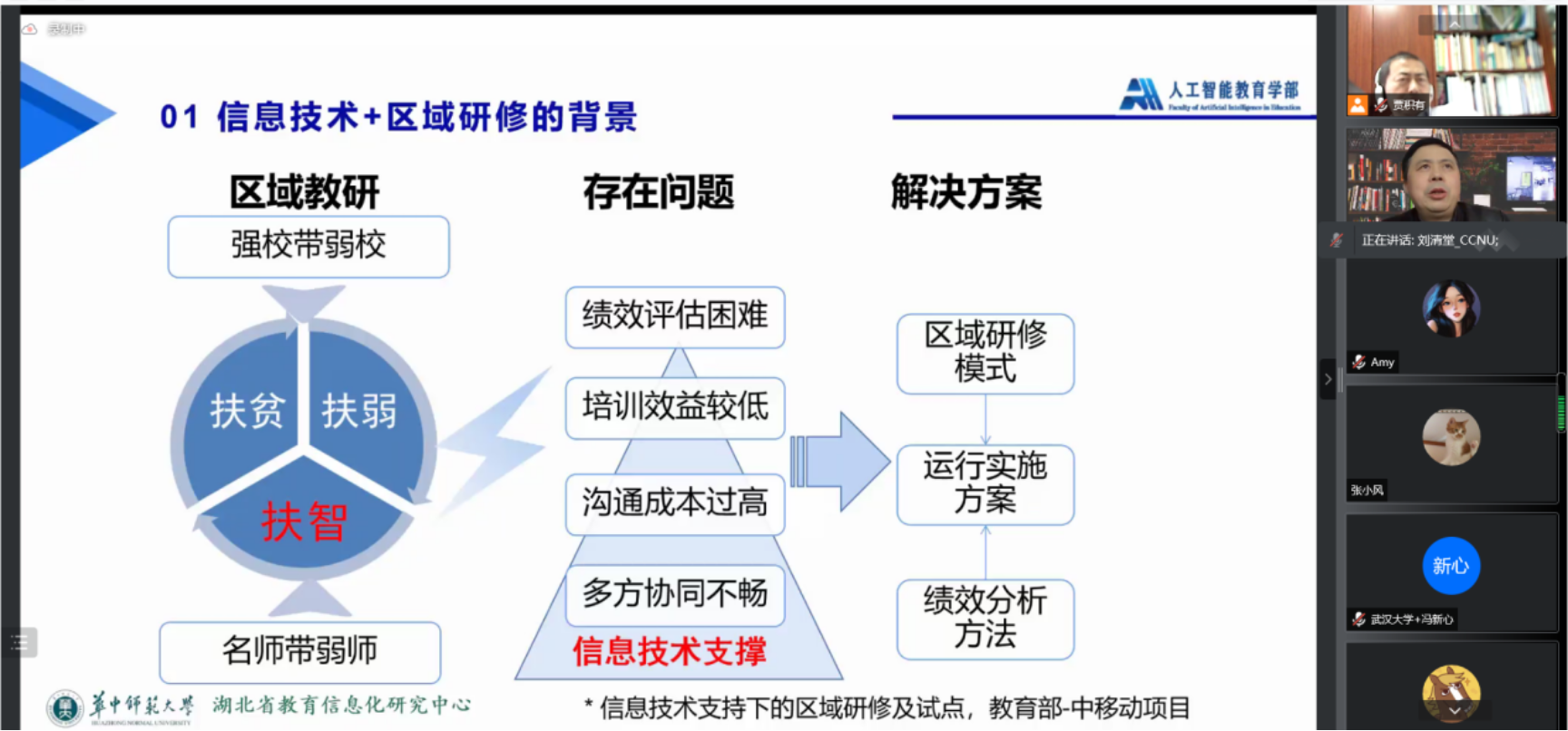在第四部分,刘教授介绍了人工智能技术赋能教师区域研修模式的典型应用,包括四种研修模式:课例研修、主题研修、微课题研修、同侪研修,研修来源于真实课堂,服务于教师专业发展。